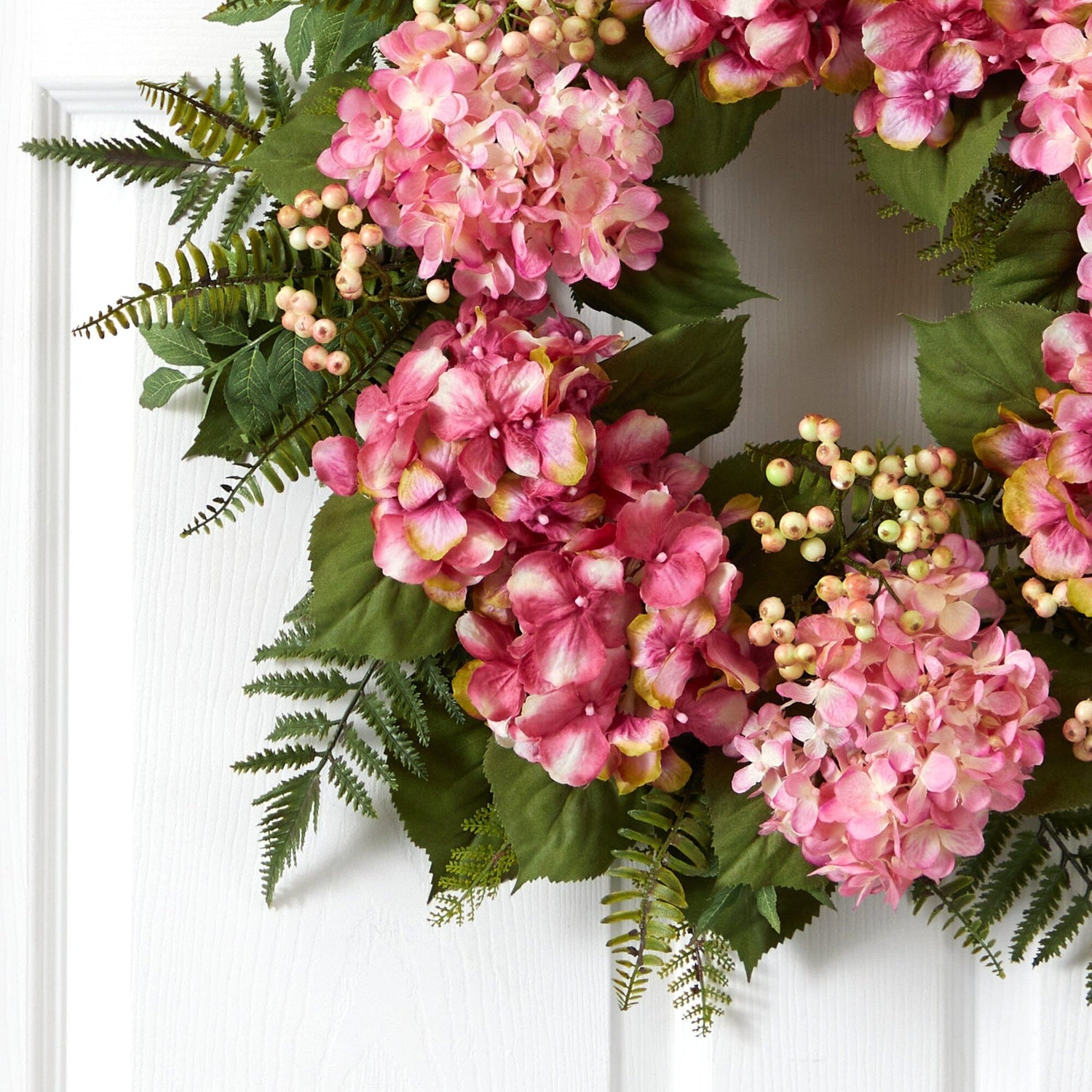 Bring the splendor of the outdoors into your home with this stunning 24” artificial hydrangea and berry wreath. For a softer feel to your bedroom or front door, add this ornament with its beautiful pink blooms that give off a playful and charming appeal.