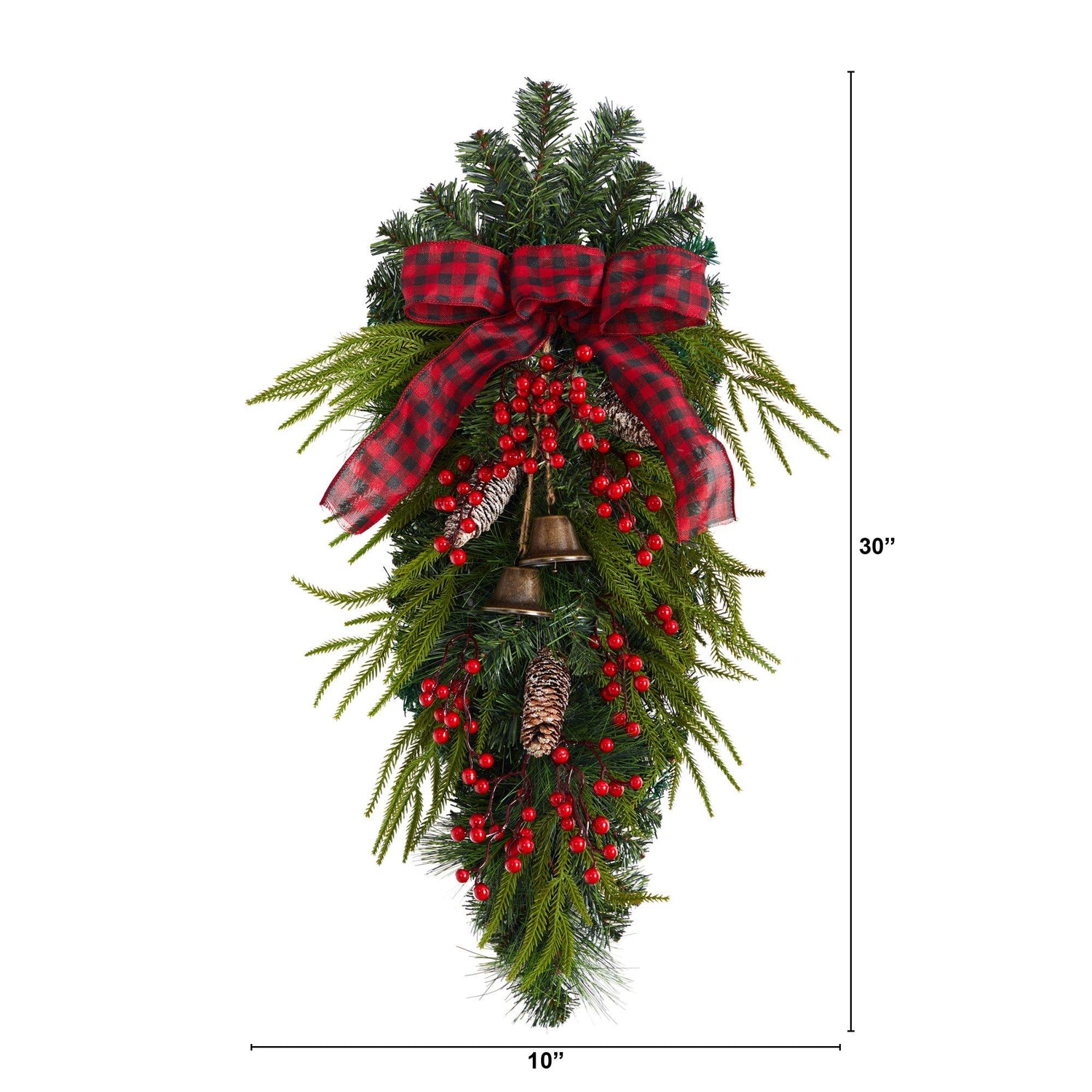 Make your traditional Christmas dreams come true with this artificial Christmas teardrop. Full of rich-colored evergreens accented by pinecones and berries, two small bells hang from the checkered bow at the center. Display in any area to bring Christmas cheer. Hanging with a full height of 30", this teardrop looks stunning on any bare wall or door. Crafted from high-quality materials, it makes a fine gift as well.