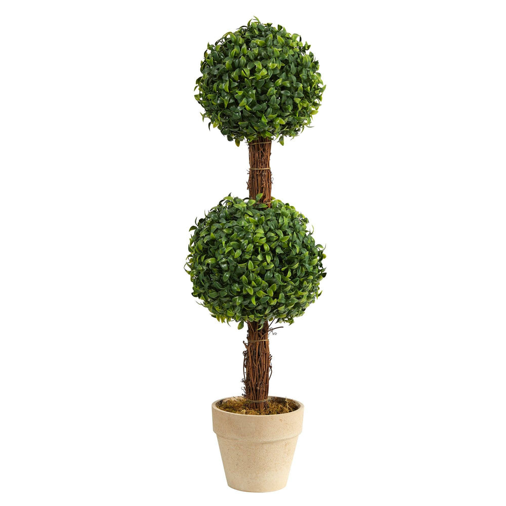 Elegantly greet guests with this double boxwood topiary. One smaller, perfectly trimmed boxwood ball sits above a larger trimmed one made of realistic-looking boxwood foliage. You can now enjoy the sophistication of the boxwood without maintenance or care. Standing 28" from a planter nestled with faux grass (included in height), curate in compact spaces. Perfect for an apartment, bathroom, room corner, or foyer.