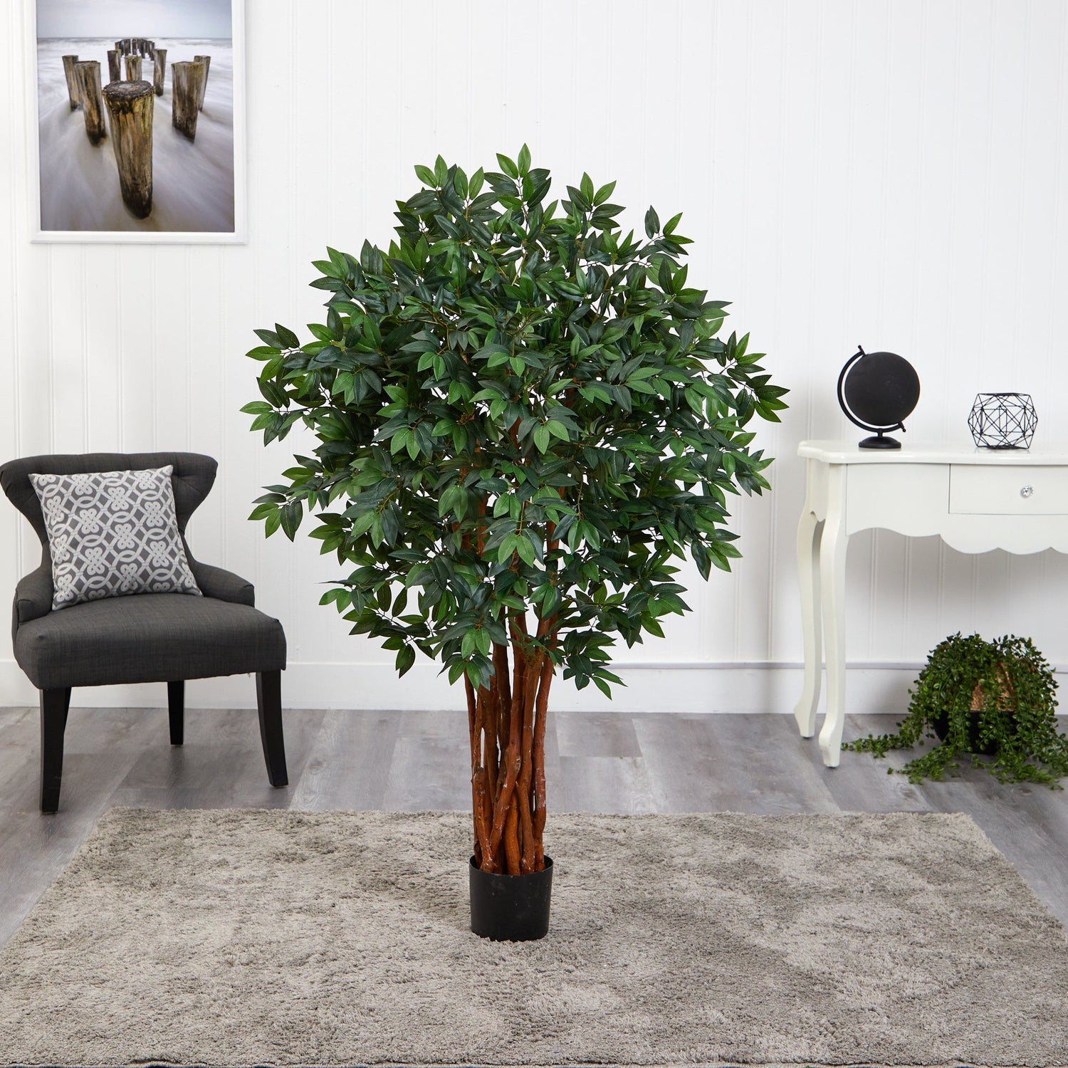 No matter where you live or what your style is, this Lychee Artificial Tree brings summer all year long. Known for bearing fruit to sweet, lychee fruits, these exotic trees are rare outside of their native China. Stemming from 7 real trunks, detailed leaves form a green foliage that give this tree a “fluffy look” at the top. Standing at 4.5', housed in a black planter, style in your bathroom, sun room, kitchen or nursery and this tropical piece will make a splash.