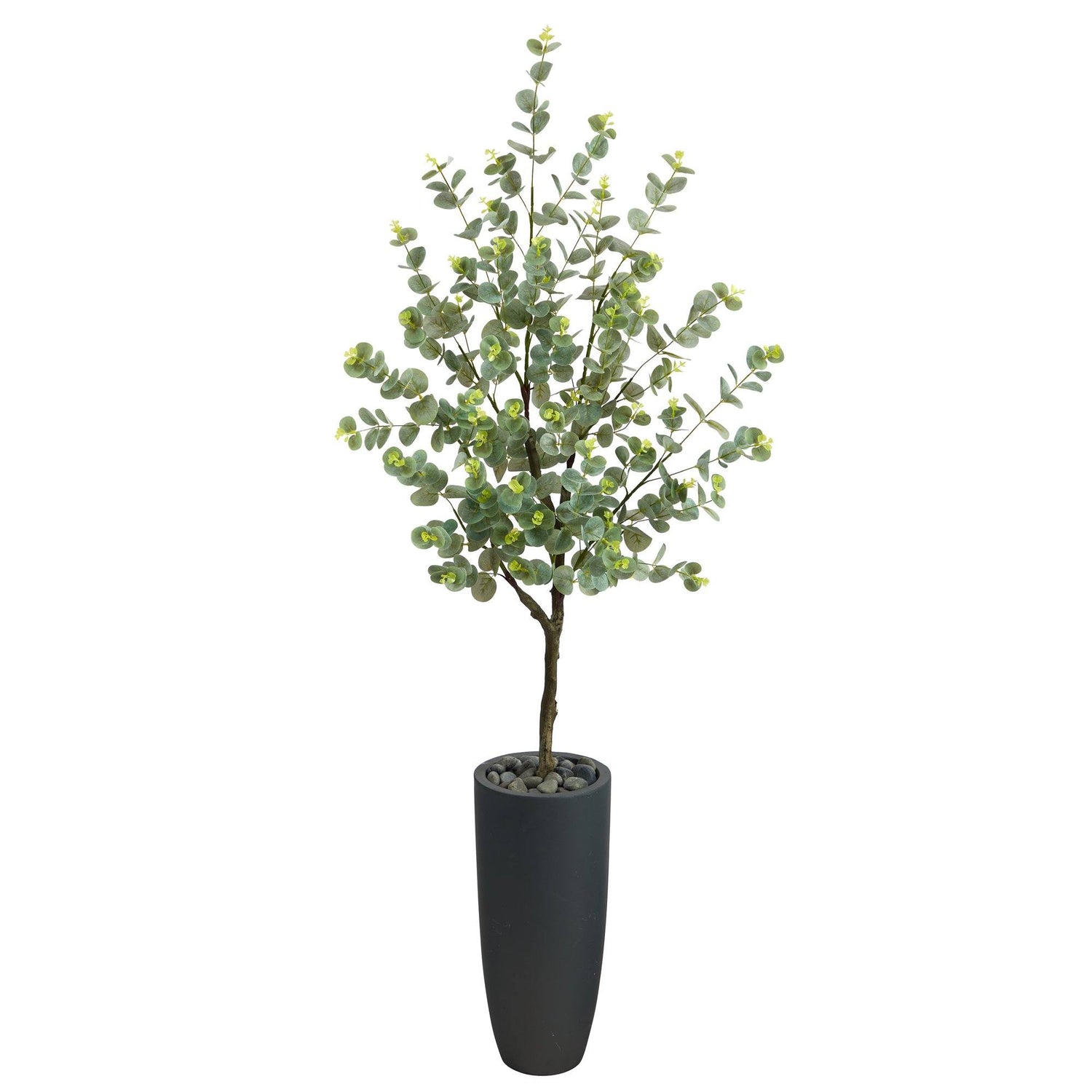 Spread the calmness of this fine Eucalyptus Artificial Tree throughout your living areas. The airy Eucalyptus leaves, known for their medicinal benefits, form a delicate palette of refined beauty. Light-hued leaves in the center of the bunch stemming from a thin, brown trunk bring contrasting colors and texture to all spaces. Standing 5' from a gray planter (included in height), curate in areas that need a soft touch. Perfect for living rooms, hallways, and bedrooms.