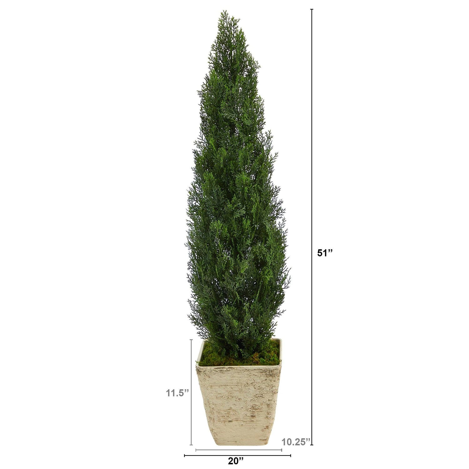 Bring the serenity of the outdoors to your space with this Cedar Artificial Tree. The green, bushy foliage creates a vertical focal point that complements many style decors. Recreate the look of a crisp, morning walk through a western national park. You can also place outdoors safely. Standing 51" from a country white planter, design in tight spaces that need a little greenery. Perfect for apartments, awkward corners, bedrooms, and foyers.
