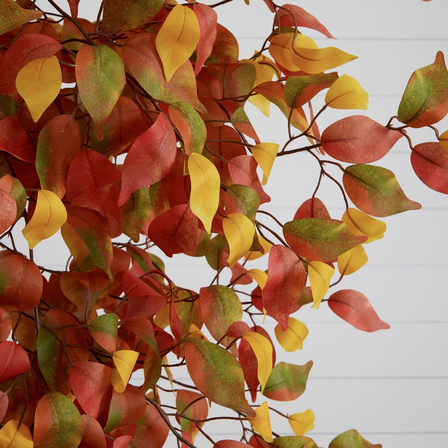 The Ficus is a classic. And for a good reason. Our customers love it so much that we created this one just for fall. This cute tree gets the job done without being the center of attention but good enough to inject some life into any area. Inspired by nature, our faux Ficus is as lifelike as can be with its slim trunk and a canopy of leaves in fall foliage hues. Crafted from high-quality materials by horticulturists, bend the branches to fit in your space. Standing 7' , house in a planter of your choice, feel free to display in any area. Perfect for a living room, bedroom, or bathroom during Thanksgiving, Halloween or autumn harvest.