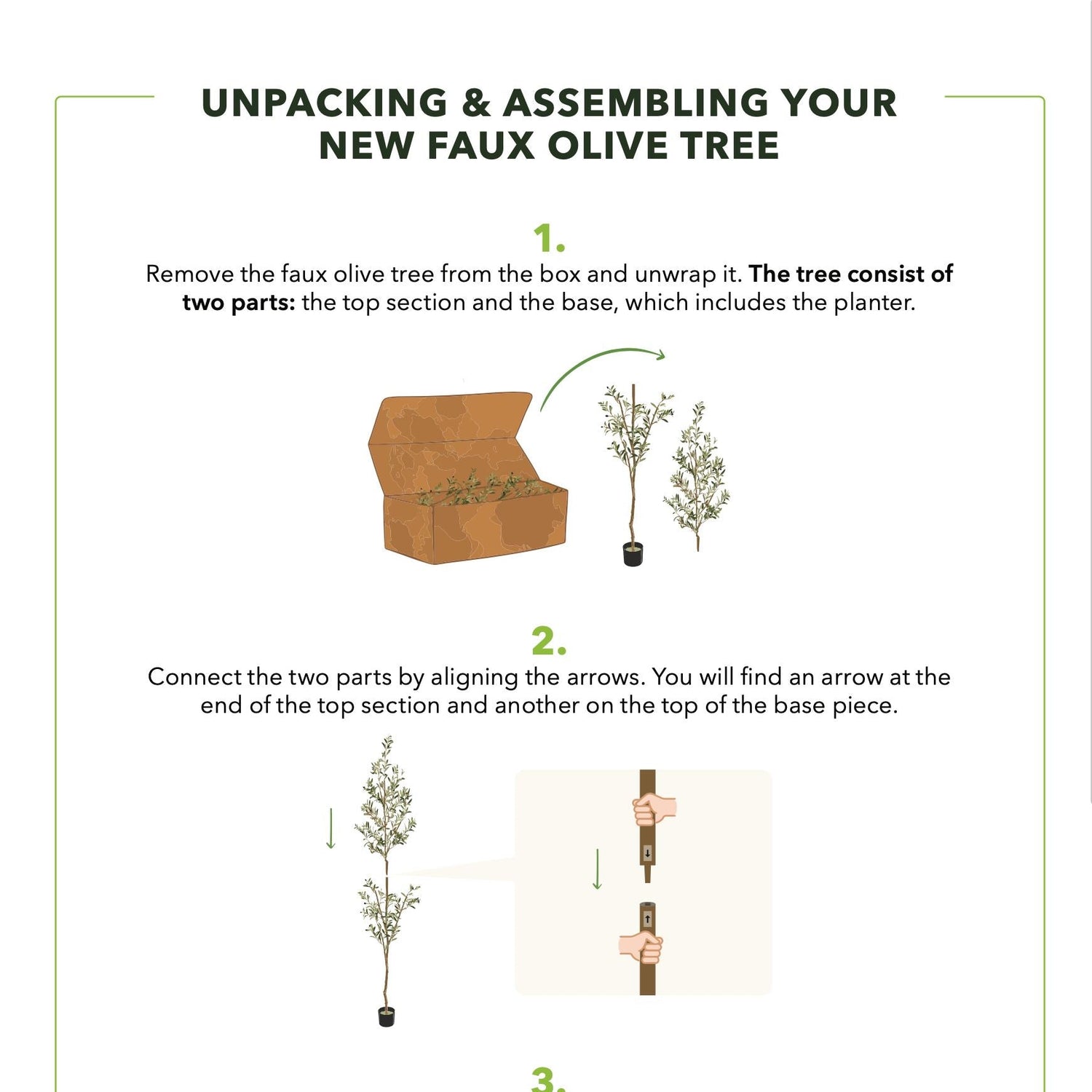To ensure your new artificial olive tree always looks fresh, dust once a month with a feather duster. Many customers recommend setting a reminder on a cellphone or simply checking for dust buildup.