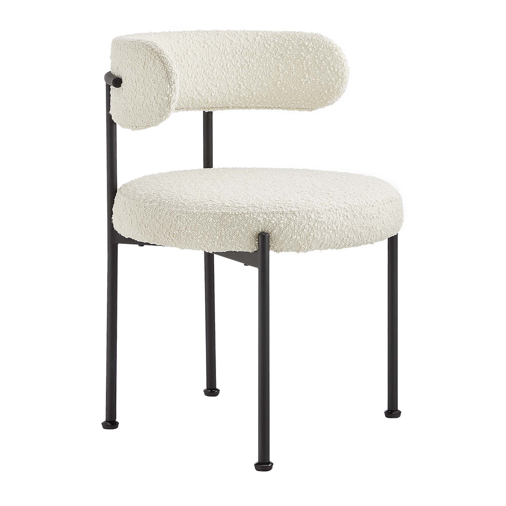 Experience luxury and modern sophistication with the Albie Boucle Dining Side Chairs - Set of 2. Upholstered in nubby textured boucle fabric, this side chair set exhibits a chic silhouette with its rounded seat and curved backrest, enhancing your dining area's aesthetic. Resting on adjustable non-marking foot pins to provide stability and protect your flooring, the bases of these dining chairs are crafted from sleek tubular metal that's the perfect complement to the charming upholstery. The dense padded foam seat cushions and backrests offer a premium seating experience during everyday mealtime or entertaining. Minimal assembly is required with easy to follow instructions. Weight Capacity: 330 lbs.