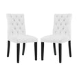 Bestow elegance with the Duchess Dining Chair. Chic and luxurious, Duchess features a stylish curvy form, richly tufted button back, dense foam padding, fine vinyl upholstery, and wood legs topped with non-marking foot caps. Resonate grace and charm with a dining chair perfect for the modern home.