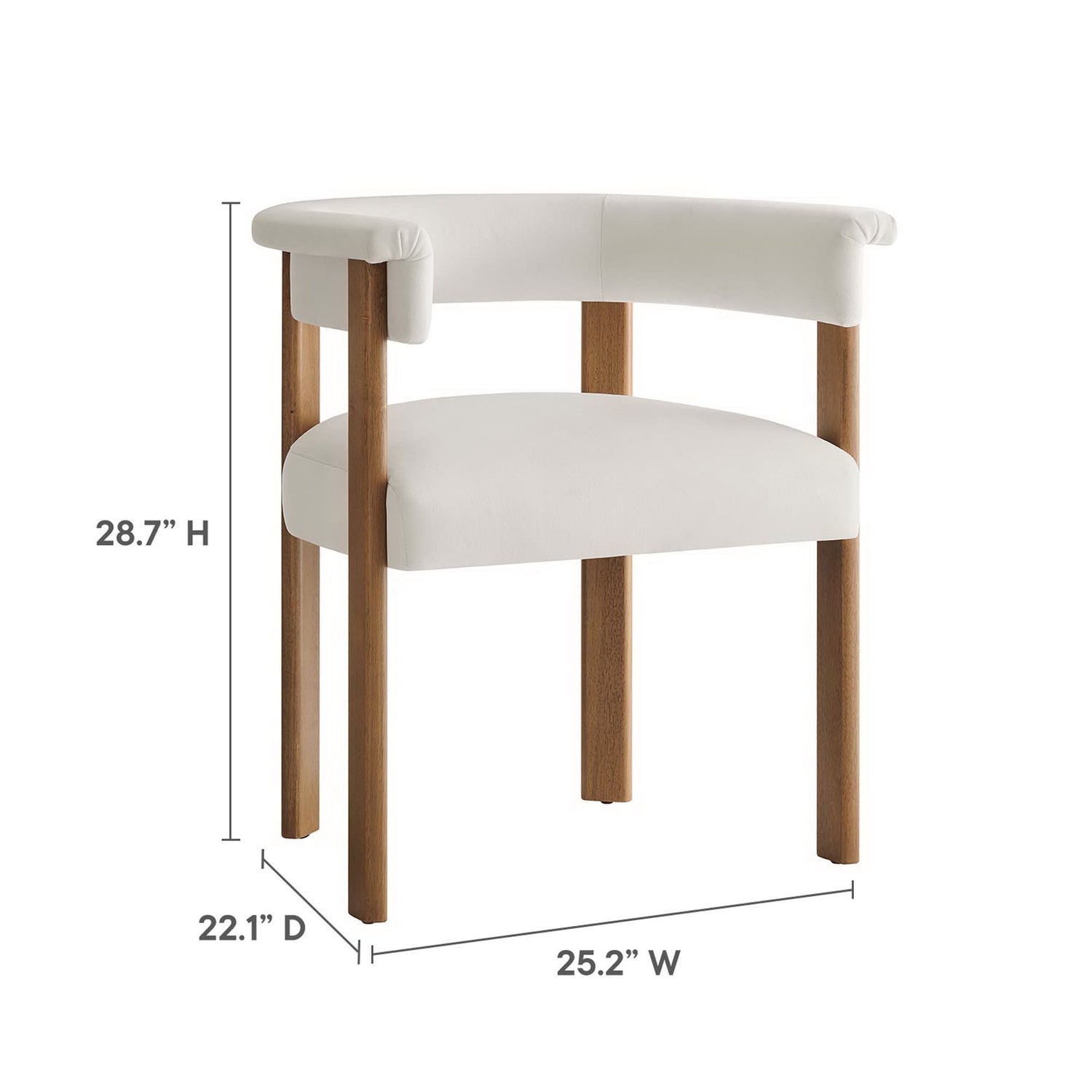 Feel the exquisite combination of modern chic and ultimate comfort with the Imogen Performance Velvet Dining Chair Set of 2. These contemporary dining chairs feature a unique barrel back silhouette that cradles you in luxury with its curved backrest and open design, offering both support and style. The foundation of each dining room armchair is built on sturdy wood legs, for durability and strength to accompany its aesthetic appeal. The seats and backrests, constructed from high-quality plywood, are enveloped in a dense layer of foam and stain-resistant performance velvet upholstery, creating an inviting look that beckons you to sit and relax well after you've finished eating. The fixed seat and cushion provide a seamless, clean look that complements any dining table with grace. These curved back dining chairs are equipped with non-marking plastic foot pins, protecting your flooring. Perfectly suited as a velvet accent chair or part of your kitchen & dining room ensemble, this set of two rounded back dining chairs seamlessly integrates with a variety of decor themes, from modern farmhouse to contemporary and minimalist aesthetics. Easy to assemble and designed with the modern home in mind, the Imogen barrel chair set is not only a practical addition to your home, but also a reflection of sophisticated taste. Dining Side Chair Weight Capacity: 331 lbs.
