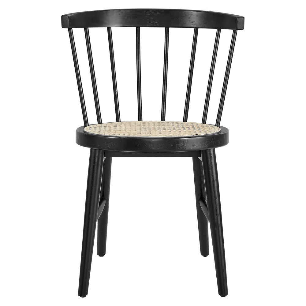 A refined take on the classic Windsor chair silhouette, the Lykke Dining Chairs bring timeless charm and updated materials to modern dining spaces. Crafted with a rubberwood frame, this dining chair set of 2 features gently curved backrests, slender spindle supports, and subtly tapered legs for a balanced, mid-century-meets-farmhouse aesthetic. The round seat is topped with a woven synthetic rattan cane inset, offering a light, breathable surface with natural texture and visual warmth. Whether styled as a pair around a breakfast table or mixed into a more eclectic dining setup, the Lykke Dining Chairs make a comfortable, design-forward addition to kitchens, dining rooms, or breakfast nooks. Weight Capacity: 400 lbs.