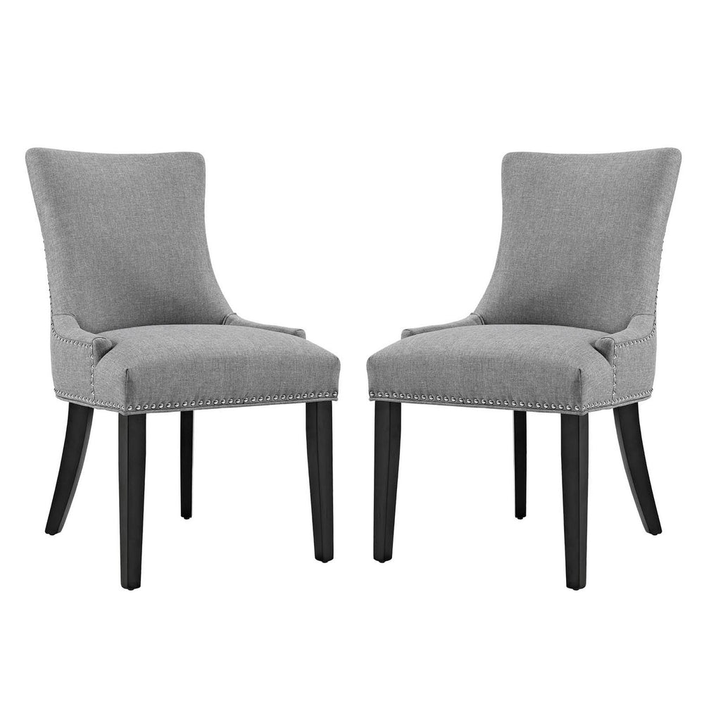 Inspire your d�cor with the Marquis Dining Side Chair. Marquis is fashioned with a chic hourglass shaped back, studded nailhead trim, non-marking foot caps, tapered wood legs, and a regal seat generously padded in foam and upholstered in polyester fabric. Marquis works well in both modern and traditional dining rooms.