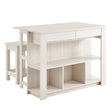 Discover the charm and functionality of the Meadowbrook 3-Piece Small Kitchen Island Set. This island table is crafted from durable particleboard, MDF, and paper laminate. This free-standing kitchen island cart features two cutlery drawers and open shelving, perfect for storing kitchen essentials and displaying decor. The innovative drop leaf design of this freestanding kitchen island not only increases your prep area but also converts it into a dining space. It comes with two matching stools, featuring square seats and footrests, which turn the island into a bar stool table for enjoying drinks post-meal. Complete with non-marking pads to protect your floors, this 3-piece island set is ideal for meal prep and casual dining, making it a stylish addition to any kitchen. Assembly required. Set Includes: 1 Kitchen Island, 2 Stools. Island Weight Capacity: 205 lbs; Stool Weight Capacity: 500 lbs.