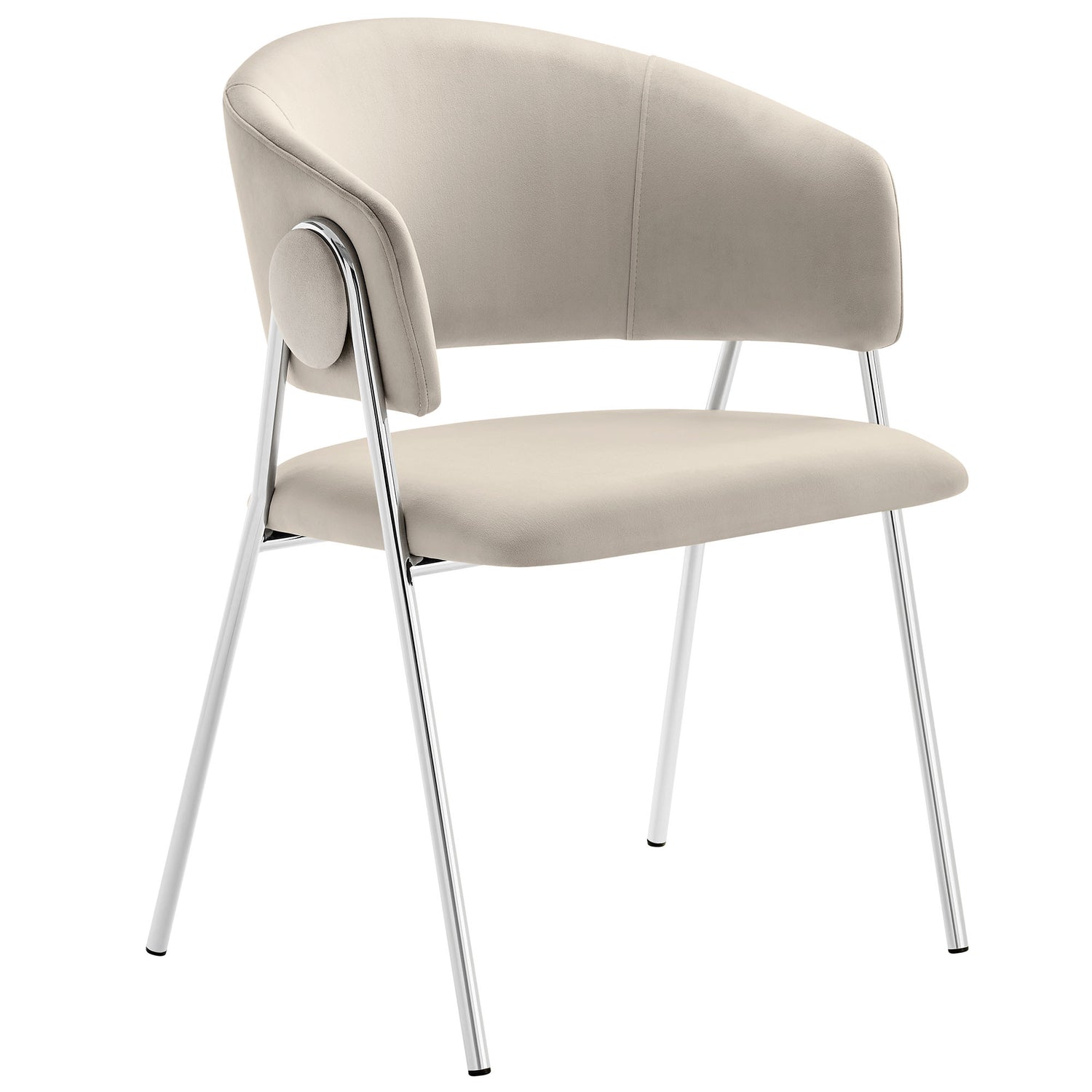 Meet Nella�a pair of velvet dining room accent chairs that blend vintage charm with versatile functionality. The seat and backrest on these padded chairs are each elegantly upholstered in stain-resistant performance velvet, and feature a stylish gap between them, shaping the elegant contour of an open back armchair. This set of 2 barrel dining chairs stand on splayed metal legs that gracefully ascend and curve around a decorative round button, enhancing the club chair's retro aesthetic. Each leg is thoughtfully finished with foot pins to protect your floors, ensuring practicality complements style. The Nella velvet kitchen table chairs do require assembly but simple instructions are included, so you can have these comfy dining chairs set up in no time. Ideal for placement around a dining table or as living room accent chairs, these curved back dining armchairs are designed to complement your interior and offer a delightful seating experience. Perfect for those who value a mix of contemporary and mid-century styles, the Nella velvet accent dining chairs introduce a tasteful highlight to any area. Weight Capacity: 330 lbs.