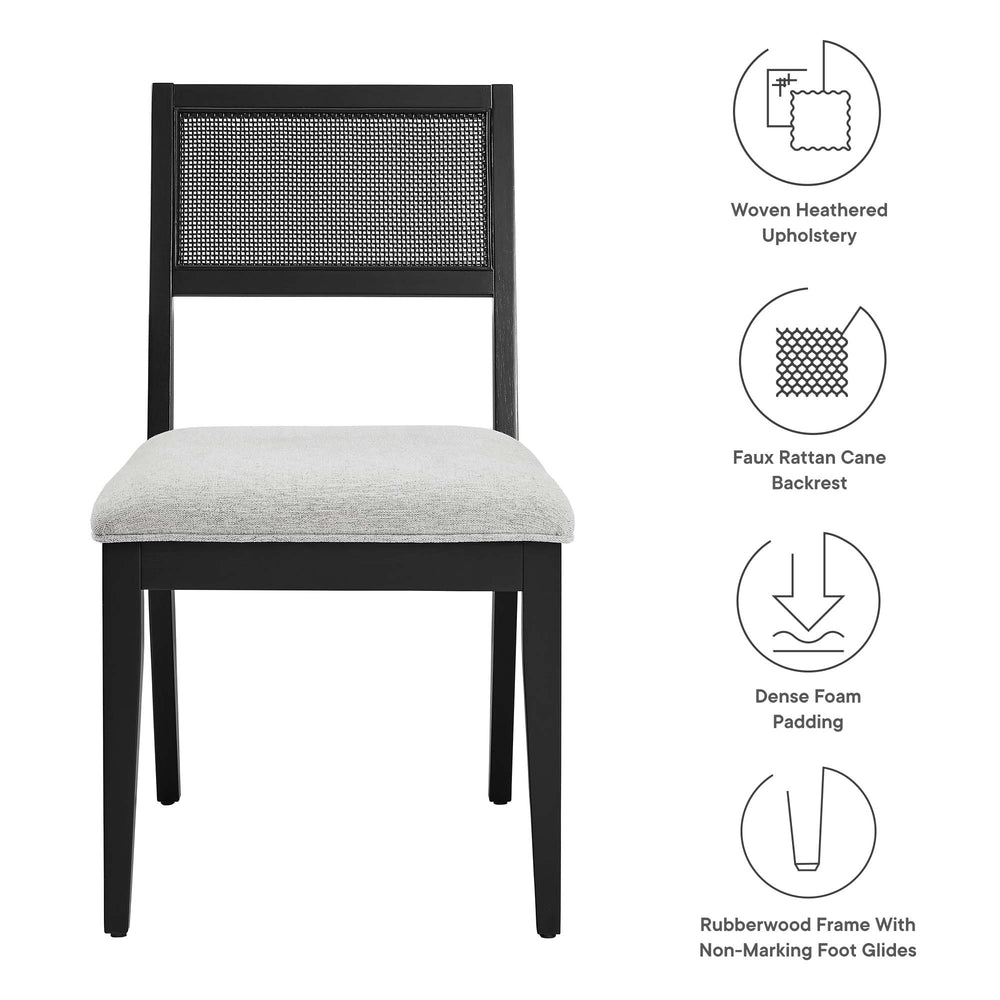 Experience the blend of natural textures and contemporary flair with the Nimba Wood Dining Chairs. Set on a solid rubberwood foundation, these mid century modern dining chairs showcase the inviting warmth of natural wood. The seats, upholstered in woven heathered fabric and padded with foam, provide cozy and supportive comfort, are ideal for extended periods of sitting, whether for dining or conversation. A backrest accented with a faux rattan weave gracefully tops off the design, entwining with the rattan chair's wooden frame to create a continuous and chic aesthetic. Tapered legs enhance the modern farmhouse chair silhouettes, complemented by foot glides for floor protection. These armless cane back dining chairs promote a clean, uncluttered look, perfect for any dining setting. The set includes two wood dining accent chairs with cane back for a cohesive dining experience. Weight Capacity for Each Side Chair: 507 lbs.