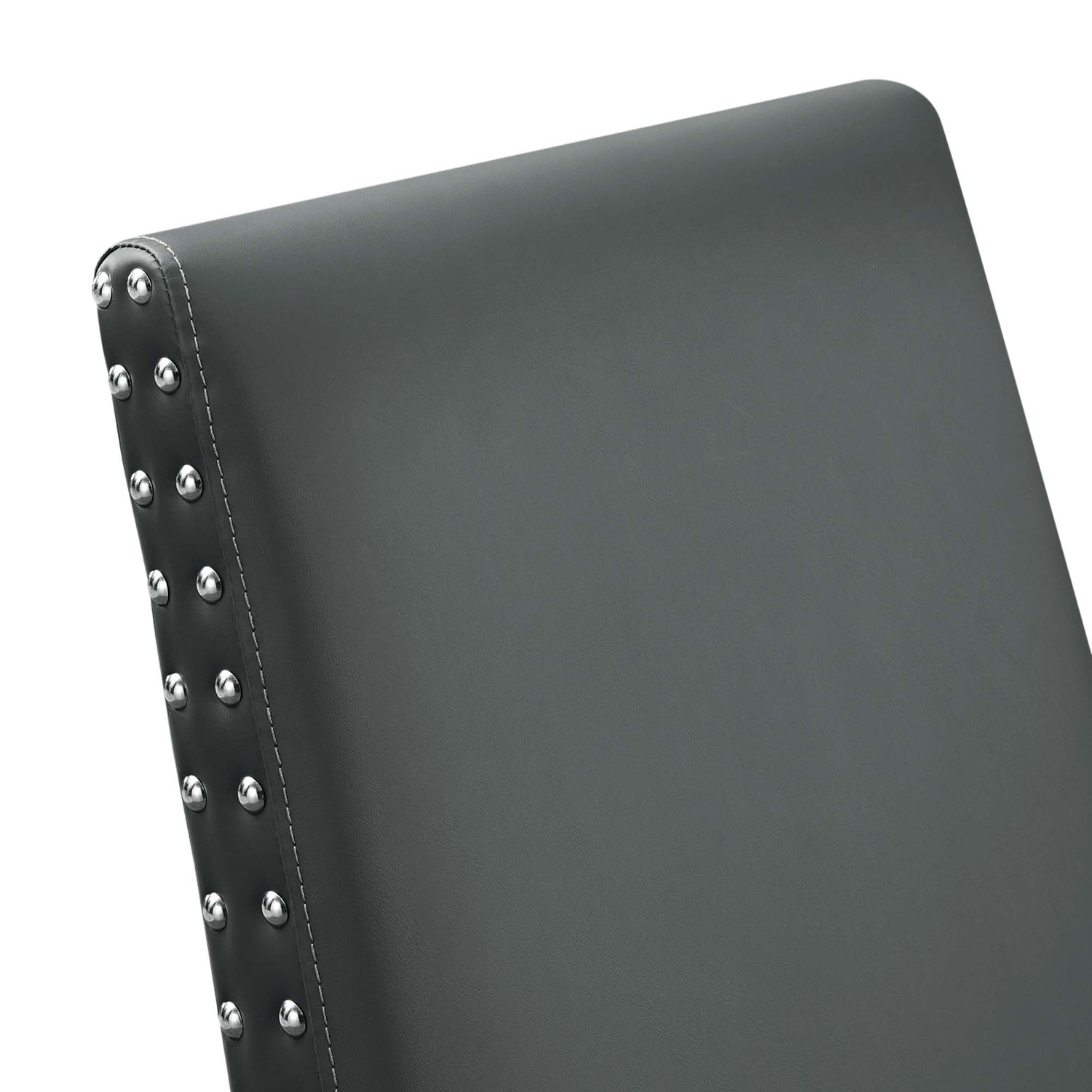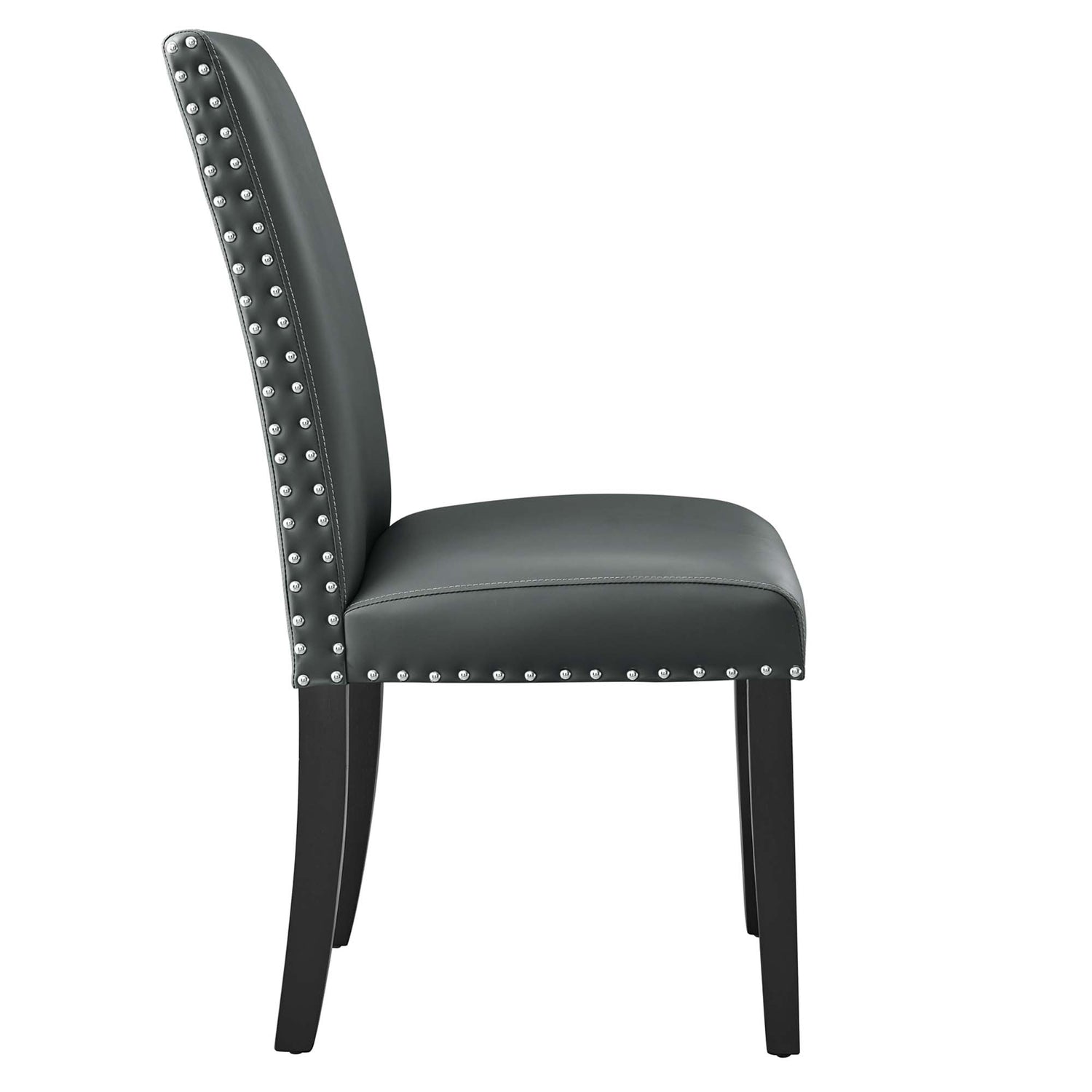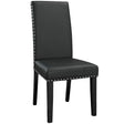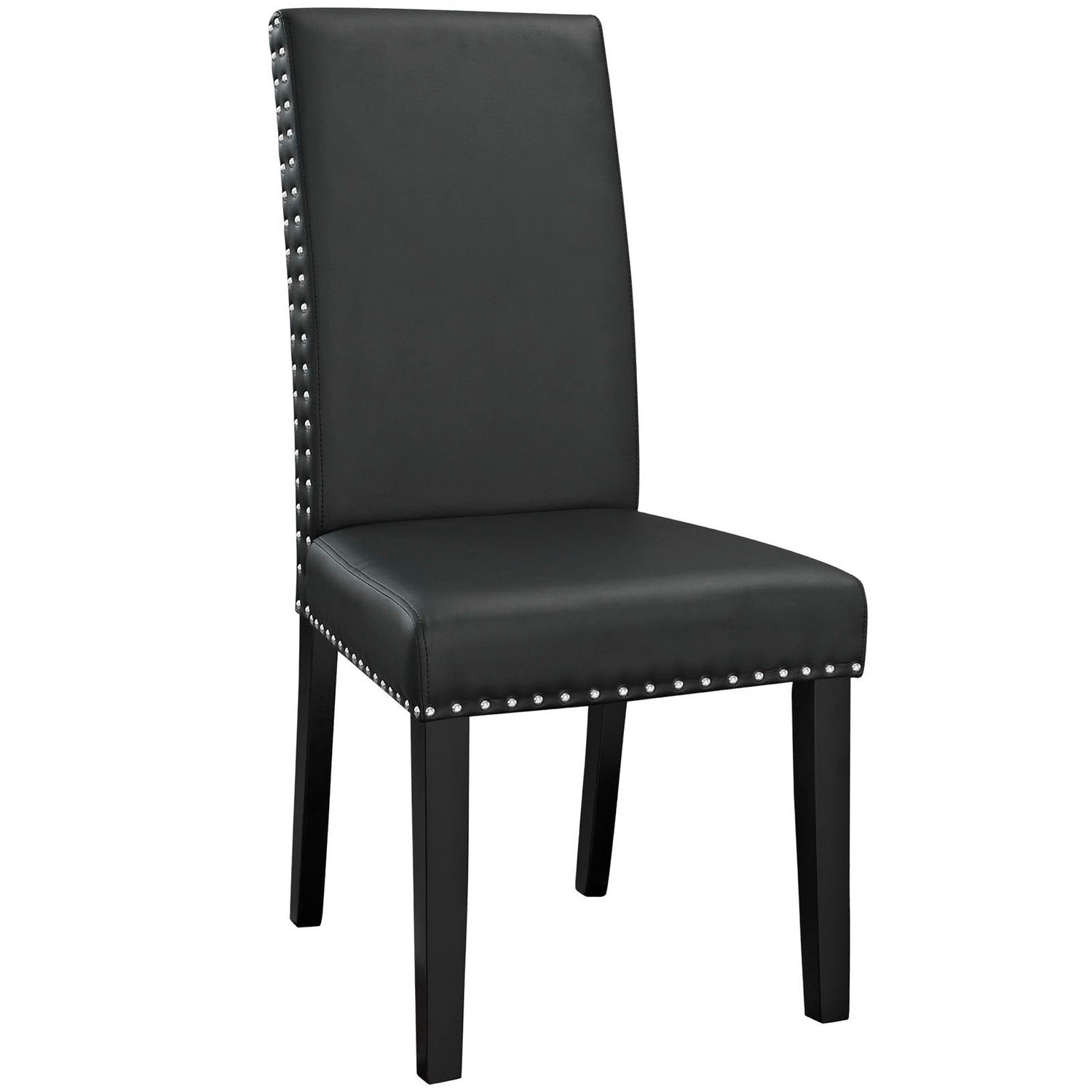 Wrap up moments of quality seating with the Parcel Upholstered Faux Leather Dining Room Side Chair. Finely upholstered in durable faux leather upholstery with elegant nailhead trim, the Parcel Accent Chair delivers a modern offering that enhances the dining room experience in a subtle and unassuming way. Padded with dense foam and supported by black stained tapered wood legs, the Parcel Side Chair is a stylish addition to your dining room, living room, lounge room, or office. Chair Weight Capacity: 285 lbs. Assembly Required.