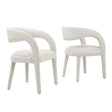 Experience the perfect blend of modern sophistication and luxurious comfort with the Pinnacle Boucle Upholstered Dining Chair Set of Two. The distinct silhouette showcases a curved backrest and an open design that effortlessly enhances your dining or living space with luxe style. This dining chair set indulges your senses with its dense foam padding, upholstered in a tactile, nubby textured boucle fabric. Non-marking plastic foot pins ensure your flooring remains free from scuffs and scratches. With minimal assembly needed, this set not only offers a stylish statement but also a hassle-free setup. Weight Capacity: 330 lbs.