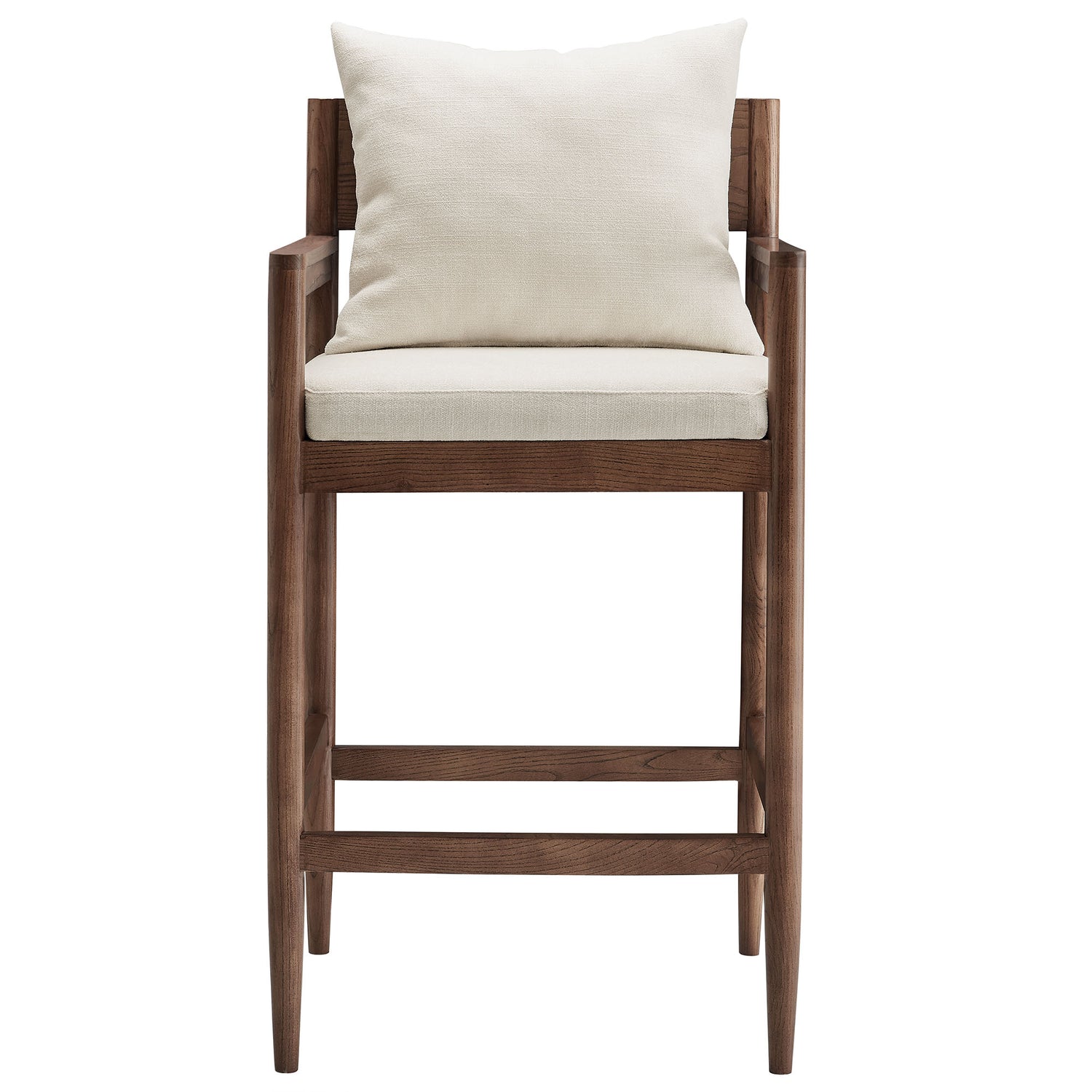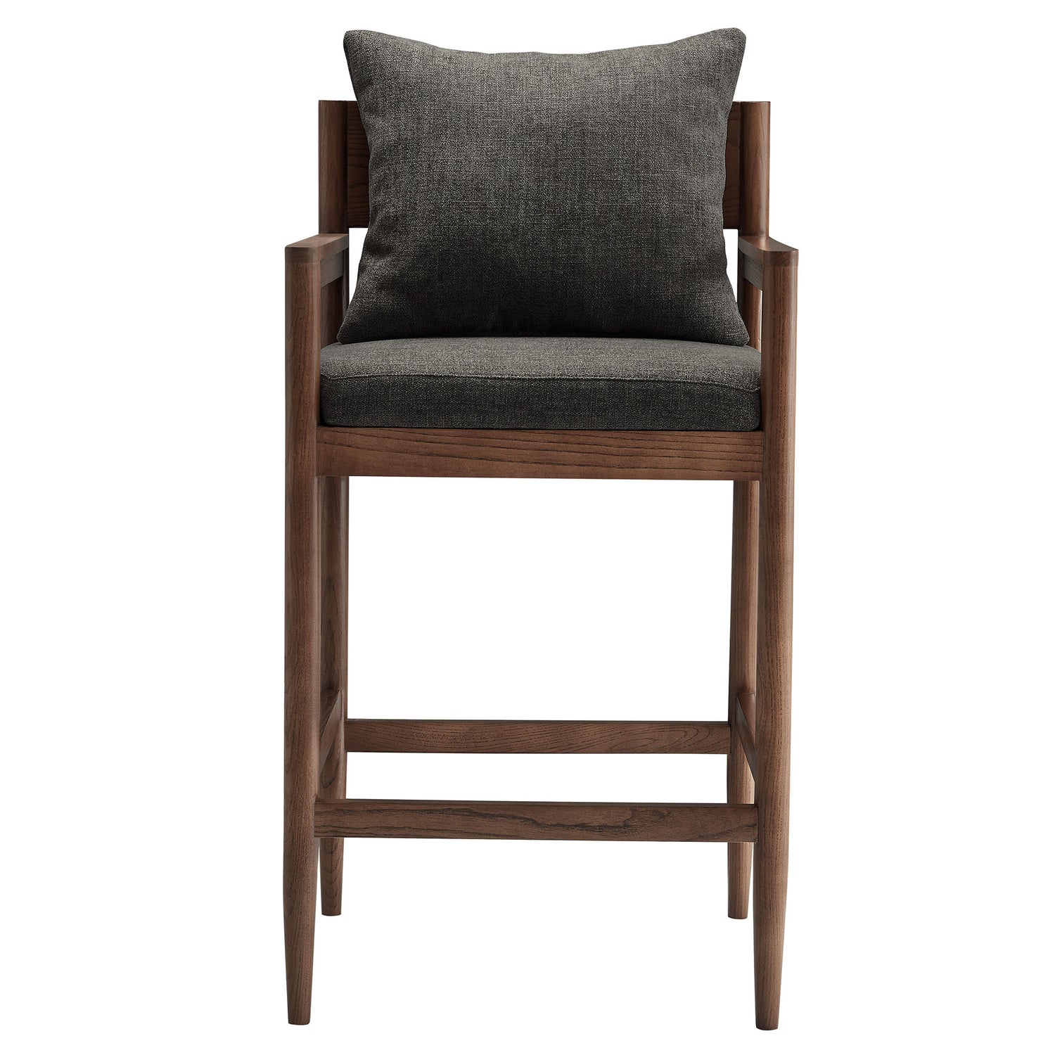Blending modern elegance with modern comfort, the Remington Bar Stool offers a refined seating experience at your bar or high-top table. This 29-inch bar height stool features a solid elm wood frame with a rich finish, showcasing clean lines, an open back, and integrated armrests. A foam-padded seat and removable back pillow are wrapped in textured slub weave fabric for a soft, supportive feel. Tapered legs bring a Scandinavian touch, with a built-in footrest ensure durability and stability. Non-marking foot glides protect floors are included. Whether styled at a home bar, kitchen counter, or high-top dining area, this modern bar height chair enhances any contemporary setting. Weight Capacity: 300 lbs.