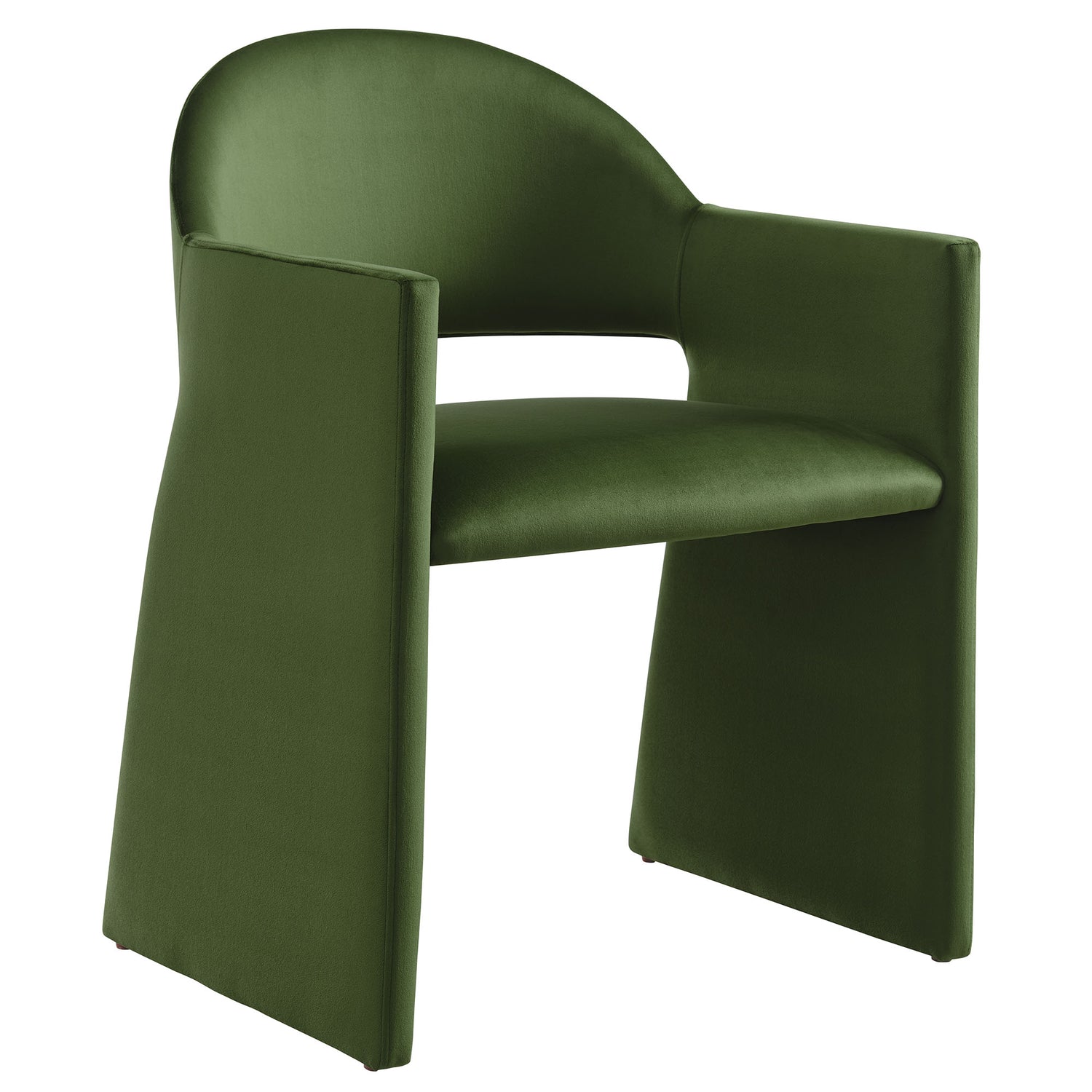 The Talia Performance Velvet Dining Chair is a stunning example of modern design, blending clean lines with luxurious comfort. Whether as a stylish living room accent chair, a statement piece in the dining area, or even a chic office accent chair, the Talia Barrel Back Dining Chair offers both timeless style and versatility. Built on a sturdy bentwood frame, this dining chair with arms is fully upholstered in soft, stain-resistant performance velvet for a premium feel. Its elegantly curved backrest flows seamlessly into wide, angular armrests that extend down to the floor, creating a sculptural look that's perfect for minimalist and contemporary spaces. The open-back design of this curved dining chair provides a light and airy feel, while the generously padded seat ensures lasting comfort. Completing the design, floor-protecting foot pins are included to prevent scratches, making it easy to move and enjoy without worry. The Talia Velvet Armchair arrives fully assembled, ready to elevate your space. Weight Capacity: 300 lbs.