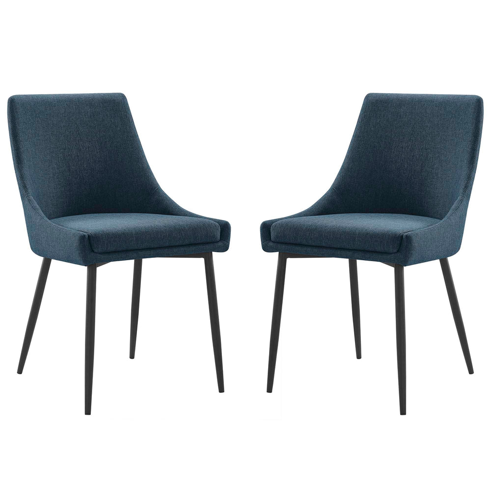 Revitalize your dining room decor with the Viscount Upholstered Fabric Dining Chairs - Set of 2. Graceful, minimalist lines blend seamlessly with the luxe comfort of Viscount9s soft and durable polyester fabric upholstery. Supported by dense foam padding and resting securely on matte black stainless steel tapered legs, Viscount is a versatile accent chair. A vintage modern style makes these fabric chairs ideally suited for a variety of rooms. Place Viscount in the dining room or kitchen as dining chairs, or in the living room, entryway, or bedroom as accent chairs. Chair Weight Capacity: 300 lbs.