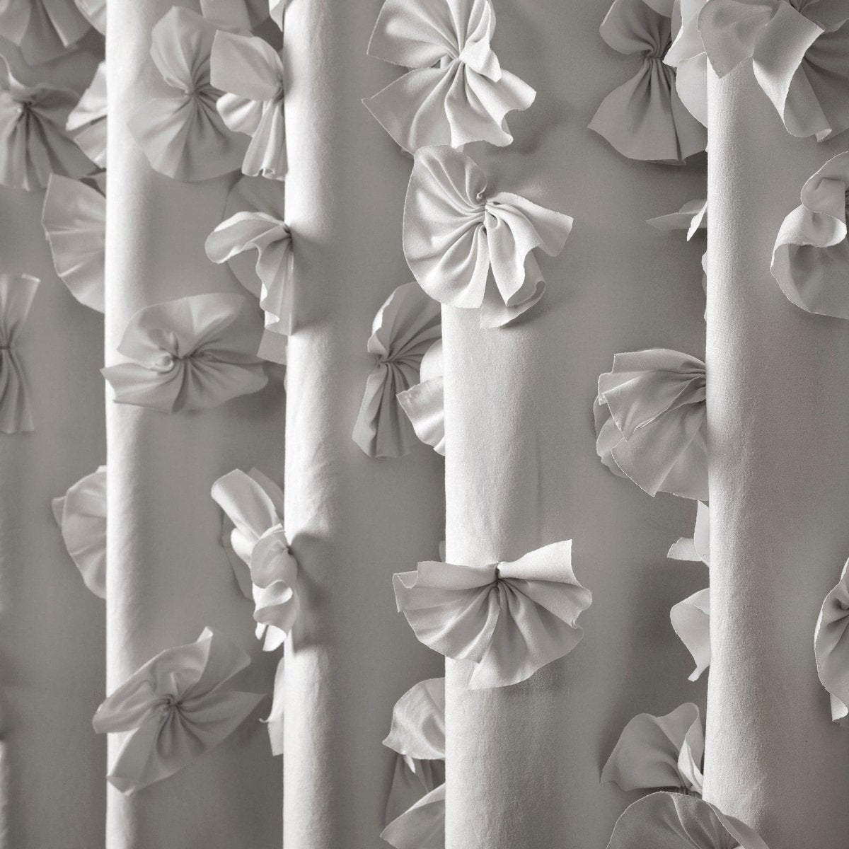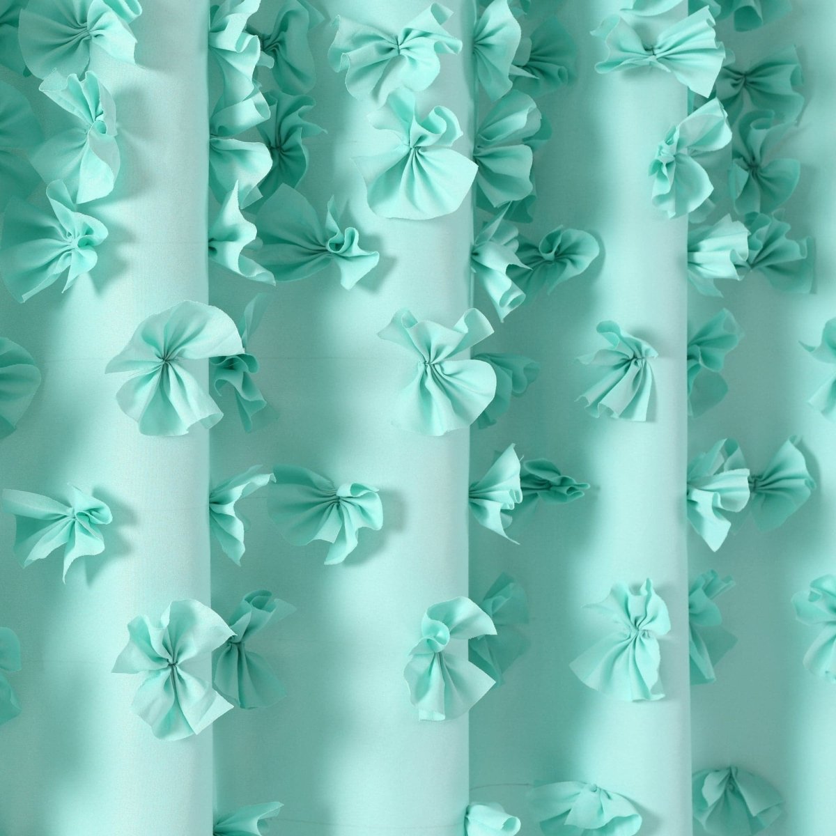 Cascades of handmade bow ties flow from top to bottom of the soft brushed poly fabric lending charm and luxury to the ambiance of your bathroom.