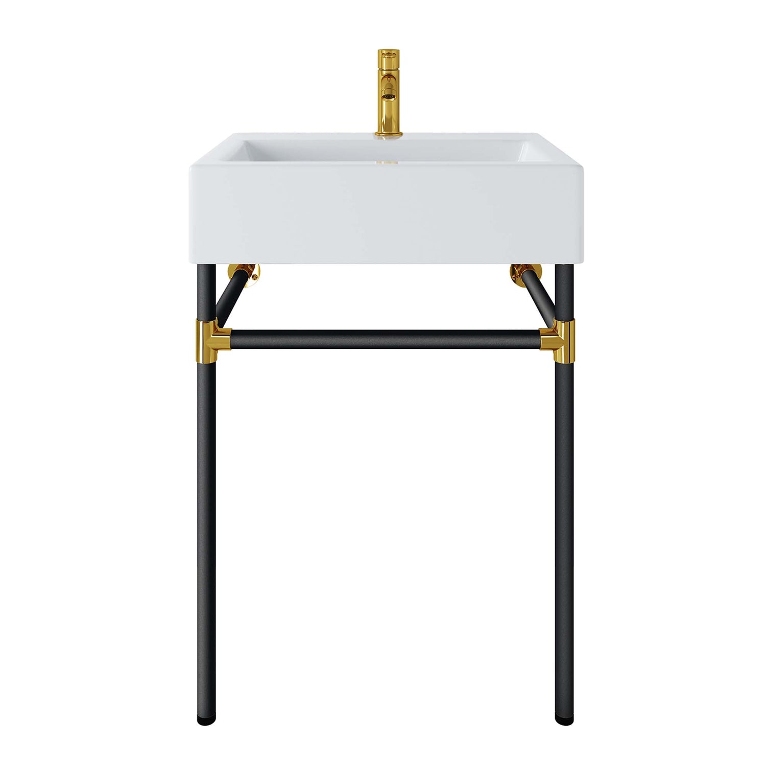 Create a bathroom oasis with the minimalist style and efficiency of the Redeem Wall-Mount Black Stainless Steel Bathroom Vanity. The glossy white ceramic basin and robust stainless steel frame affix directly and securely to the bathroom or powder room wall. Redeem dispenses gentility in spaces large and small, resting confidently on a sturdy black metal frame with gold joints for added stability. This small bathroom vanity has a single faucet hole and is outfitted with non-marking foot caps to protect your bathroom floor. Assembly required and fixtures not included.