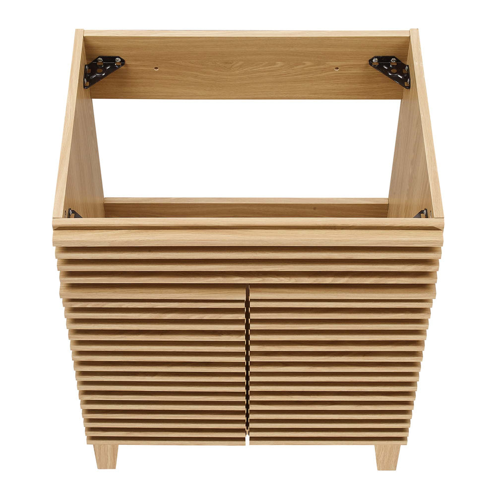 Tap into mid-century aesthetics with the Render Vanity. Render Bathroom Vanity features a durable MDF and particleboard frame with smooth walnut grain laminate, four tapered wood legs, and adjustable storage shelf behind two soft-close hinged doors. Sleek lines and crisp design align for an edgy style designed to meet your needs. Boasting a mid-century modern style this vanity features a solid construction with a pleasing look and practical functionality. Assembly required and sink basin not included.