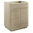 Tap into mid-century aesthetics with the Render 24 Inch Bathroom Vanity Cabinet. This slatted bathroom cabinet features a durable particleboard frame with faux travertine laminate and a sturdy plinth base. It includes an adjustable shelf behind two soft-close hinged doors, providing ample room for plumbing and storage. Designed to be paired with a sink basin and fixtures of your choice, this bathroom vanity with no sink is ready to complete your bathroom with your personal touch. Boasting a mid-century modern style, the Render bathroom vanity offers a solid construction with a pleasing look and practical functionality. Assembly required. Vanity bathroom sink and fixtures are not included.