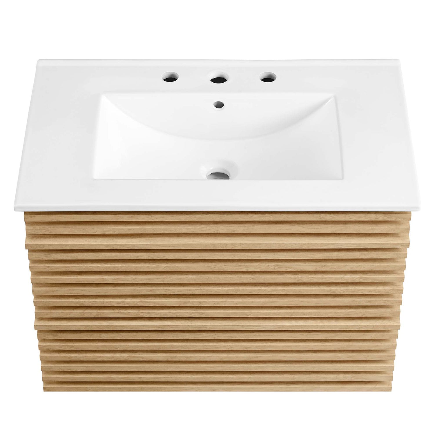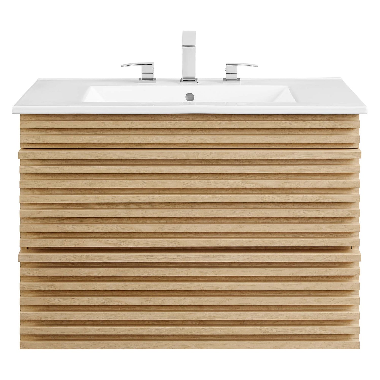 Tap into mid-century aesthetics with the Render Vanity. The Render 30" Bathroom Vanity features a durable MDF and particleboard frame with smooth walnut grain laminate, ample storage space in two full-extension drawers, and space-saving wall-mount design. Crafted with ceramic, a single sink with an integrated countertop, 8" widespread faucet holes, and rectangular sink basin continue the sleek look of this retro modern vanity. Clean lines and crisp design align for an edgy style designed to meet your needs. Boasting a mid-century modern style this vanity features a solid construction with a pleasing look and practical functionality. Assembly required and fixtures not included.