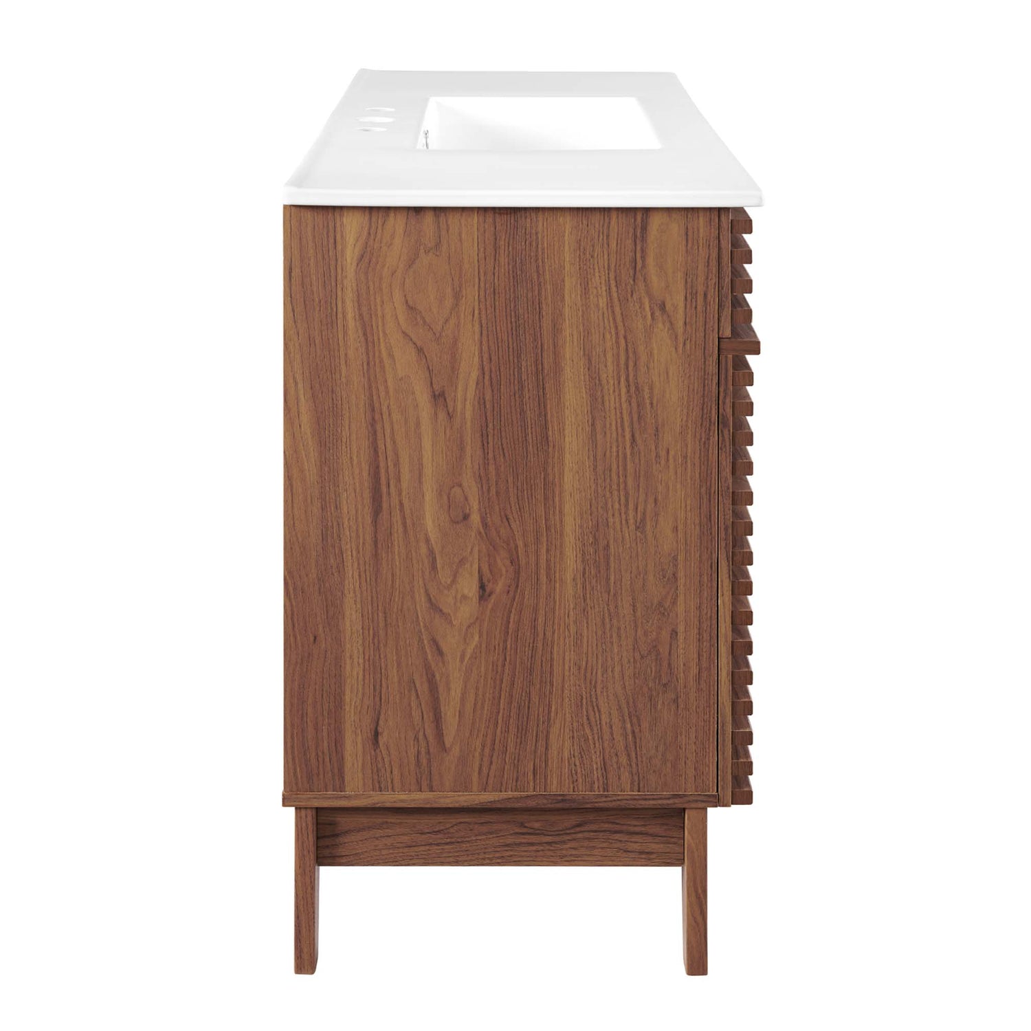 Tap into mid-century aesthetics with the Render Vanity. The Render 48" Bathroom Vanity features a durable MDF and particleboard frame with smooth walnut grain laminate, four tapered wood legs, and ample under sink storage space in full-extension drawers and behind soft-close hinged doors. Crafted with ceramic, a single sink with an integrated countertop, 8" widespread, and rectangular sink basin continue the sleek look of this retro modern vanity. Clean lines and crisp design align for an edgy style designed to meet your needs. Boasting a mid-century modern style this vanity features a solid construction with a pleasing look and practical functionality. Assembly required and fixtures not included.