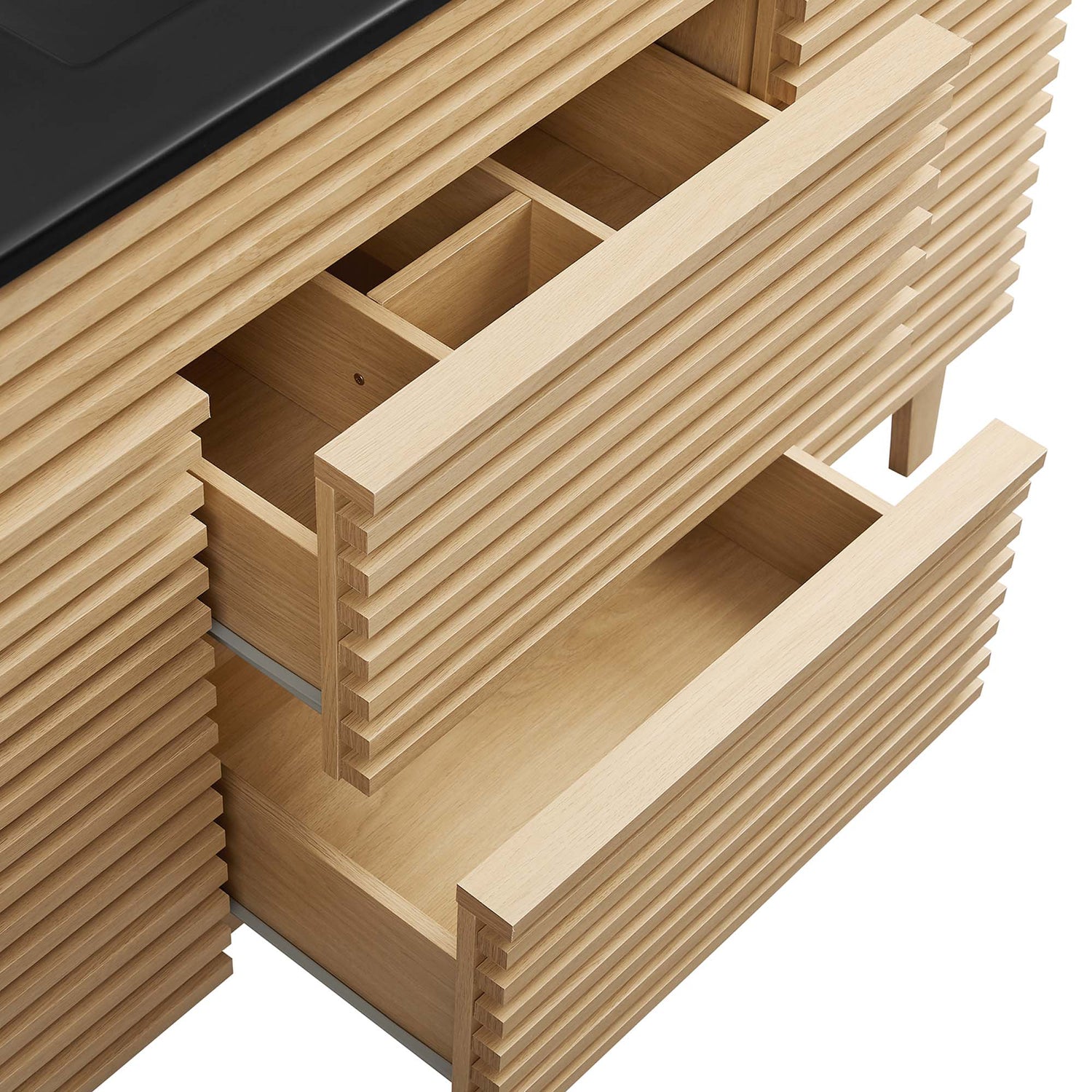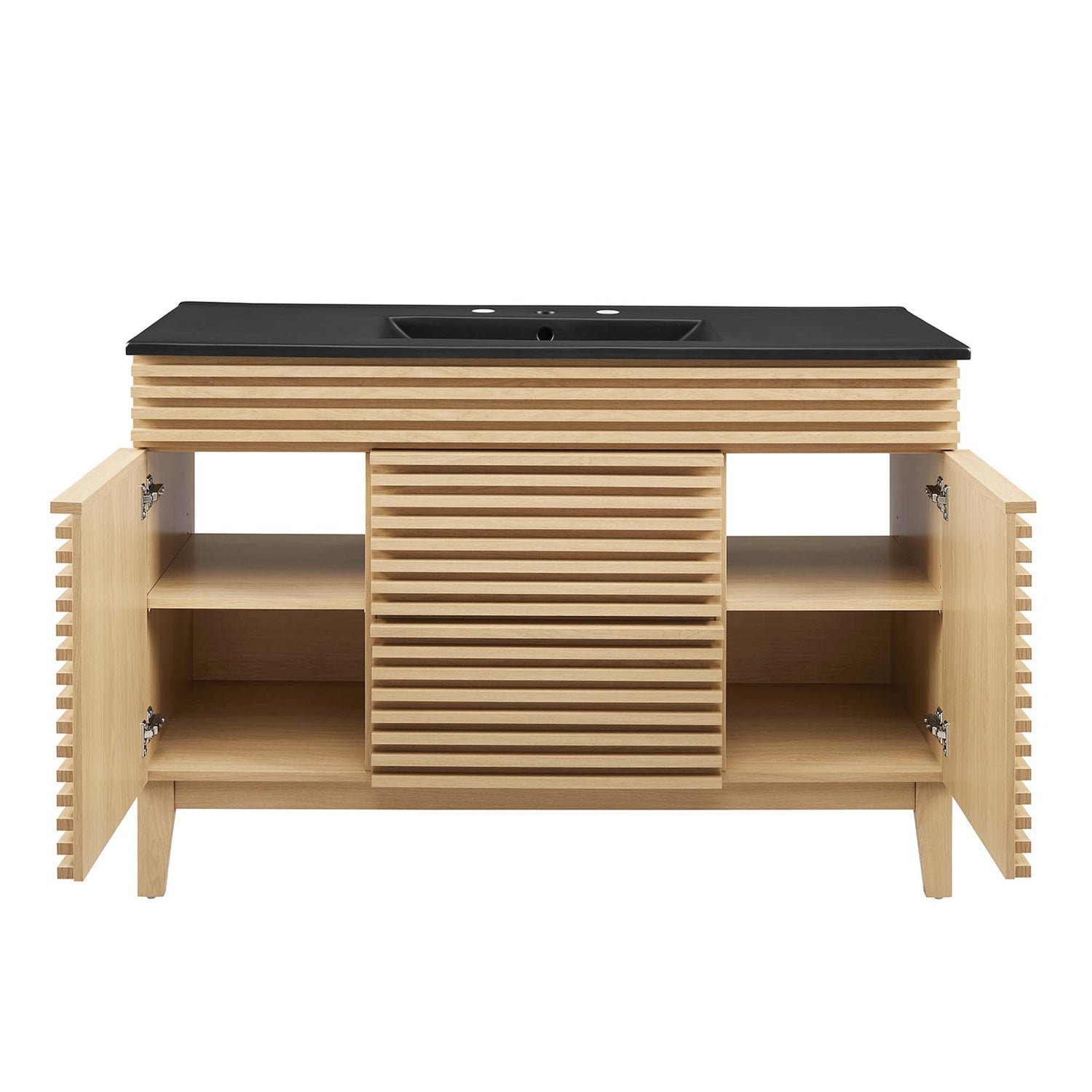 Tap into mid-century aesthetics with the Render Vanity. The Render 48" Bathroom Vanity features a durable MDF and particleboard frame with smooth walnut grain laminate, four tapered wood legs, and ample under sink storage space in full-extension drawers and behind soft-close hinged doors. Crafted with ceramic, a single sink with an integrated countertop, 8" widespread faucet holes, and rectangular sink basin continues the sleek look of this retro modern vanity. Clean lines and crisp design align for an edgy style designed to meet your needs. Boasting a mid-century modern style this vanity features a solid construction with a pleasing look and practical functionality. Assembly required and fixtures not included.