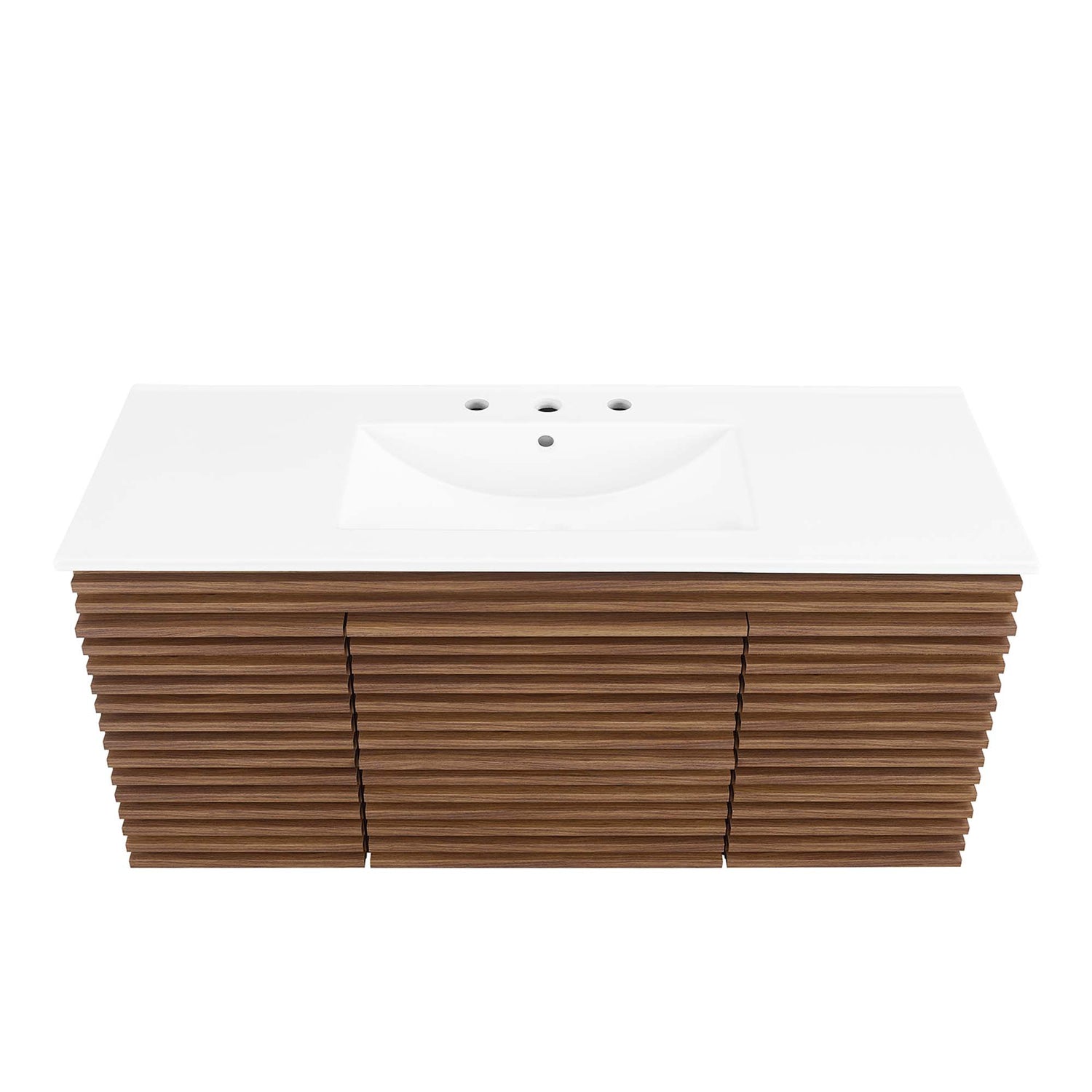 Tap into mid-century aesthetics with the Render Vanity. The Render 48" Single Sink Bathroom Vanity features a durable MDF and particleboard frame with a smooth laminate, ample storage space in two full-extension drawers, adjustable shelves behind soft-close hinged doors, and a space-saving wall-mount design. A curved ceramic basin with an integrated countertop and 8" widespread faucet holes creates sleek lines and a crisp design for an edgy look designed to meet your needs. Boasting a mid-century modern style this vanity features a solid construction with a pleasing look and practical functionality. Assembly required. Fixtures not included.