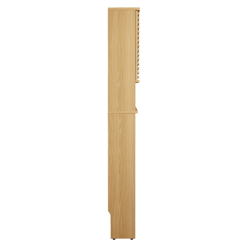 Tap into mid-century aesthetics with the Render Over the Toilet Storage Cabinet. This bathroom organizer over the toilet boasts one open shelf and a concealed storage area behind 2 soft-close hinged doors. Each door displays beautifully designed slatted details, creating sleek lines and a crisp look designed to bring modernity to your bathroom space. These doors open to reveal adjustable shelves within, offering a tailored storage solution. Matching the doors' modern aesthetic, the rest of this over the toilet organizer with cabinet is just as thoughtfully designed, featuring a durable particleboard frame with smooth wood grain laminate. Abounding in mid-century modern style, this above toilet storage cabinet offers a solid construction with a pleasing look and practical functionality perfect for storing towels, linens, toilet paper, makeup, and other bathroom essentials. This toilet cabinet includes non-marking floor glides to protect flooring. Assembly required.