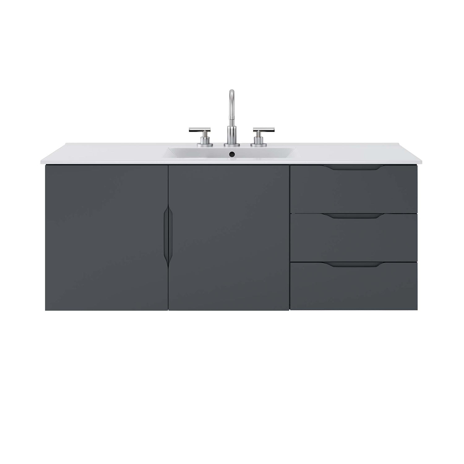 Energize your bathroom space with the modern design of the Vitality 48" Wall-Mount Bathroom Vanity. Boasting a sleek, clean-lined silhouette, this vanity is durably crafted with particleboard and MDF with a melamine finish. This vanity features a wall-mount design and is complete with ample storage space for all your bathroom essentials with two spacious drawers and an under-sink storage area behind two soft-close doors. This vanity is complete with a ceramic sink basin with 8-inch widespread holes and an integrated countertop. This vanity boasts an open back to accommodate plumbing. Fixtures not included. Assembly required.