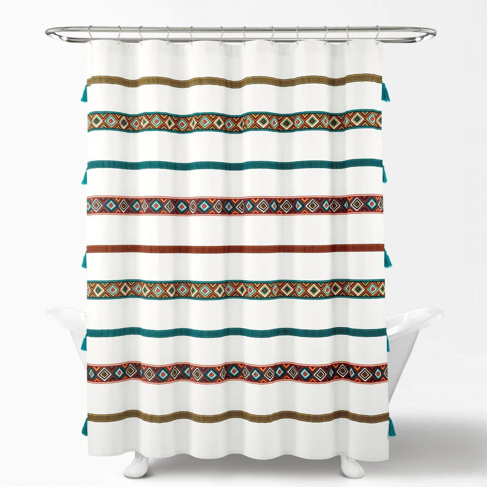 A shower curtain so cute, you'll wish it could decorate more than just the bathroom! With patterned stripes and tassels for texture, this shower curtain brings the all the relaxing boho vibes into your teen’s, guest or primary bathroom makeover. Dress your bohemian bathroom with the chic style of this decorative shower curtain. The stripes with diamond patterns and stylish little tassels can inspire a complete bohemian look. Crafted from a 70% recycled cotton/30% recycled polyester fabric blend. Each side of this shower curtain measures 72 inches and should fit most standard bathtubs. Dry cleaning recommended when caring for this product.