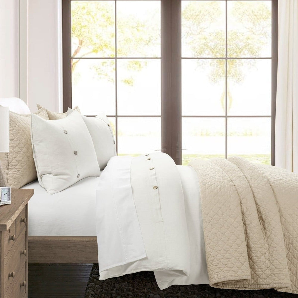 Luxury and comfort find a harmonious balance with this Belgian Flax Linen Rich Cotton Blend Duvet Cover 3 Piece Set. Thermal regulation and durability are just a few of the superior benefits of this fabric Belgian flax cotton blend. Garment washed for appearance and comfort, this duvet cover and matching shams are embellished with coconut shaded buttons for a casual yet elegant look.