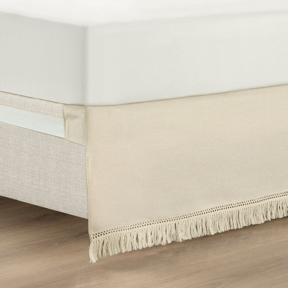 Bed skirts give any bed a more styled look and offer the added benefit of hiding all the items stored underneath the bed. Complete your boho or southwest bedroom look with this Boho Fringe 15-Inch Tailored Drop Easy Fit Bed Skirt. Assembly has been made easy for you with the easy elastic fit.?áInstead of going under the mattress, it goes around the mattress -- simply wrap the bed skirt around the perimeter of your box spring or bed so you don't have to lift your mattress.