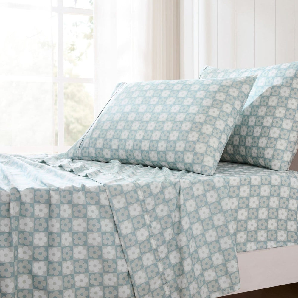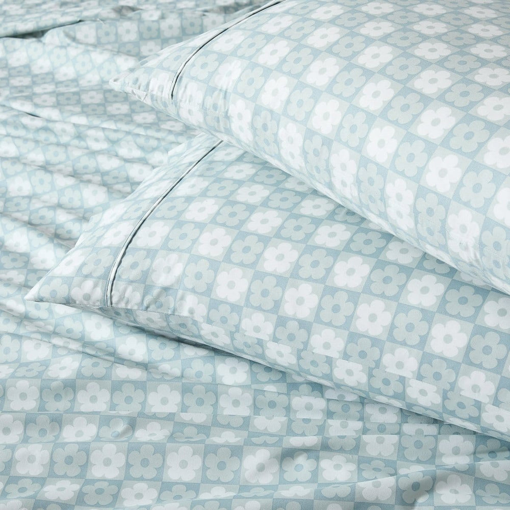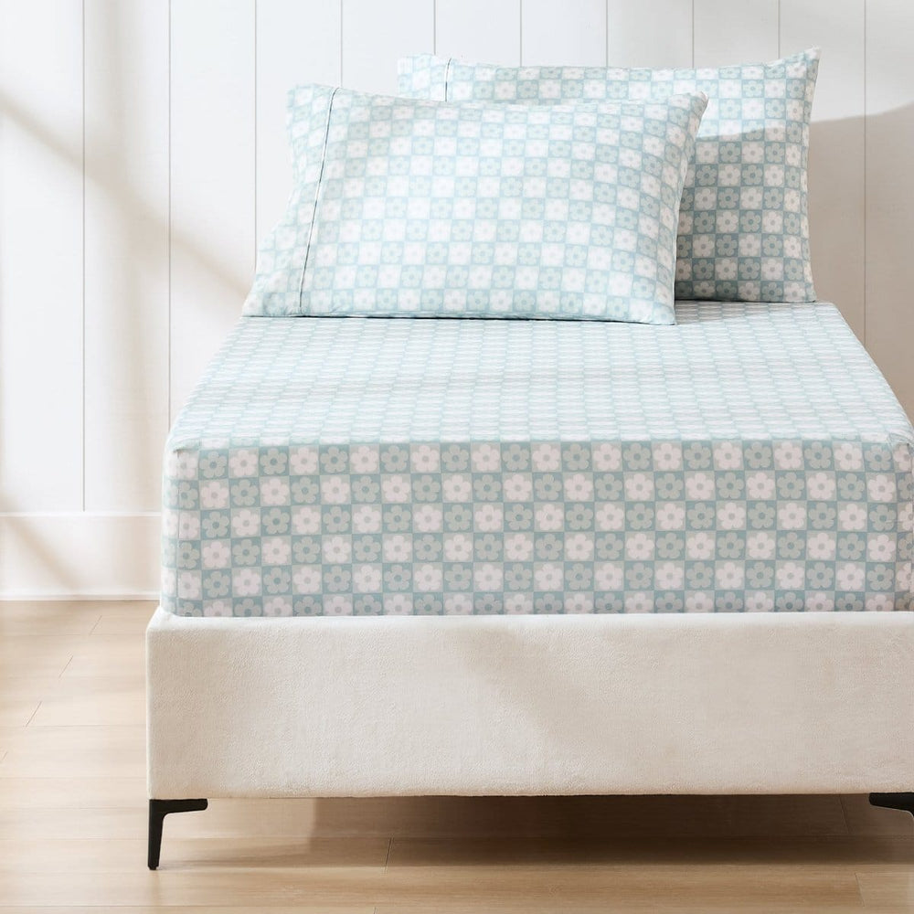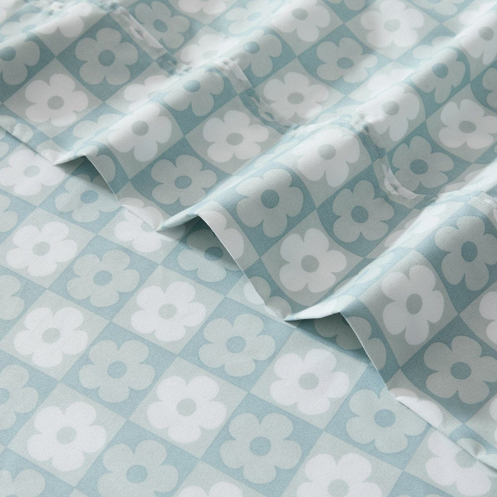 Add a touch of groovy charm to your space with this fun floral sheet set. Showcasing a checkerboard pattern of playful daisies, these bed sheets are great for boho, mid century modern, and retro themed kids' bedrooms. Made with soft microfiber, this multi-piece set includes 1 flat sheet, 1 fitted sheet with a 14" drop pocket, and 2 or 4 pillowcases. STANDARD 100 by OEKO-TEX® certified, all components have been tested and certified free from harmful substances. Machine washable for easy care.