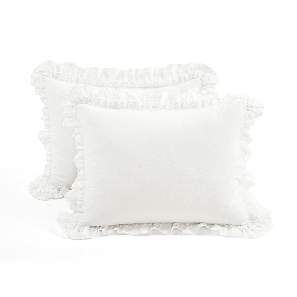 The Ella Ruffle Lace 100% Cotton Duvet Cover 3 Piece Set includes a soft and luxurious duvet cover and two matching pillow shams. The pillow shams even have the ruffled edges with the lace trim! It is available in both King and Full/Queen sizes.