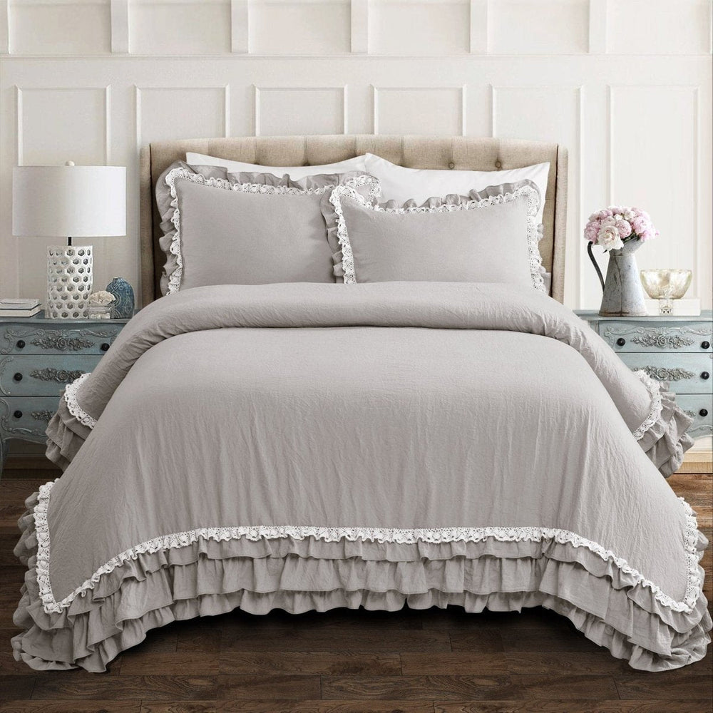 The Ella Ruffle Lace 3 Piece Comforter Set includes a soft and luxurious 230 GSM comforter and two matching pillow shams. The pillow shams even have the ruffled edges with the lace trim! It is available in both King and Full/Queen sizes in?áfour neutral options, including white, ivory, neutral, and light gray.
