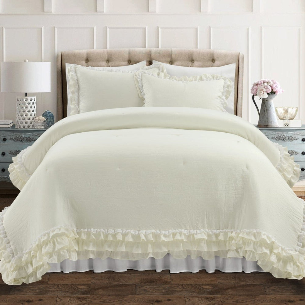 Part of the Ella Ruffle Lace Collection.- 3-Piece Set Includes: One Comforter, Two Pillow Shams