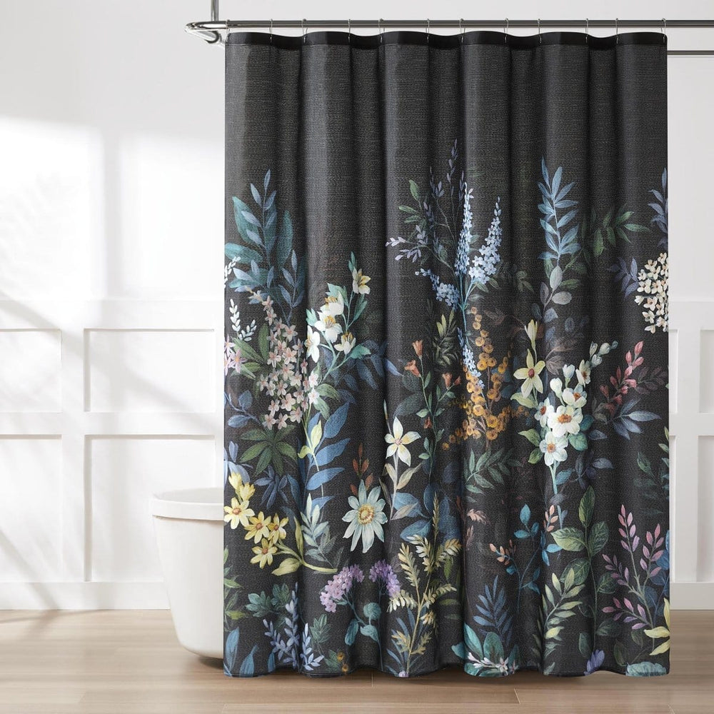 Step into a midnight oasis with this botanical shower curtain. This bath curtain adds drama and charm to your bathroom with a floral print on a rich black canvas. Perfect for modern Victorian or gothic decor style. Crafted from a soft polyester fabric and measuring 72 inches wide by 72 inches long. Installation is easy with 12 button holes at the top to hang with shower hooks or rings. Pair this fabric shower curtain with a liner, sold separately. STANDARD 100 by OEKO-TEX® certified, all components have been tested and certified free from harmful substances. Machine washable.