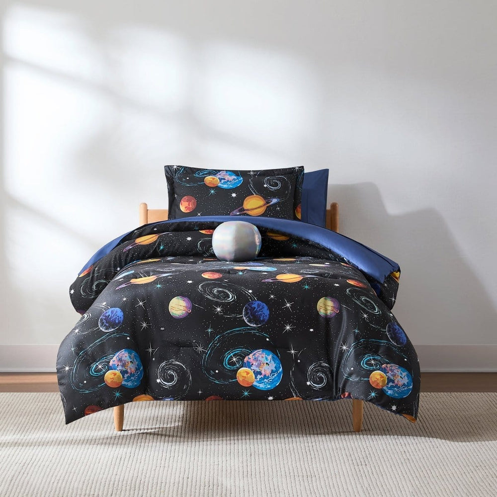 Your little astronaut will love this outer space themed kids comforter set! Featuring an out-of-this-world print of planets, stars, and galaxies floating in the universe, it makes the perfect addition to any science obsessed kids' or tweens' bedroom. Made with a soft microfiber and medium weight polyfill for year-round comfort. This all-in-one bedding set makes styling your child's bed a breeze! Including 1 comforter, 1 or 2 sham, 1 decorative pillow, 1 flat sheet, 1 fitted sheet with a 14" drop pocket, and 1 or 2 pillowcases. STANDARD 100 by OEKO-TEX® certified, all components have been tested and certified free from harmful substances. Machine washable.