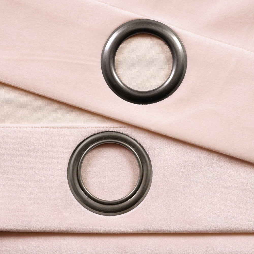 Metal grommets on the Prima Velvet Solid Grommet Light Filtering Window Curtain Panel Set slide onto the curtain rod for simple installation. The grommets measure about 1.6 inches in diameter.