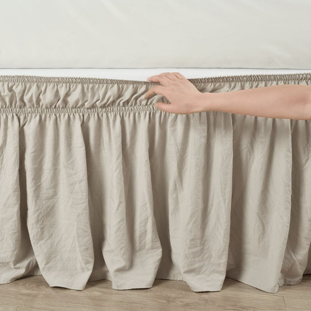 Add a chic look to your bed with this bed skirt. A double-elastic band secures the Ruched Ruffle Elastic Easy Wrap Around Bed Skirt in place. No lifting of the mattress is required for easy installation.