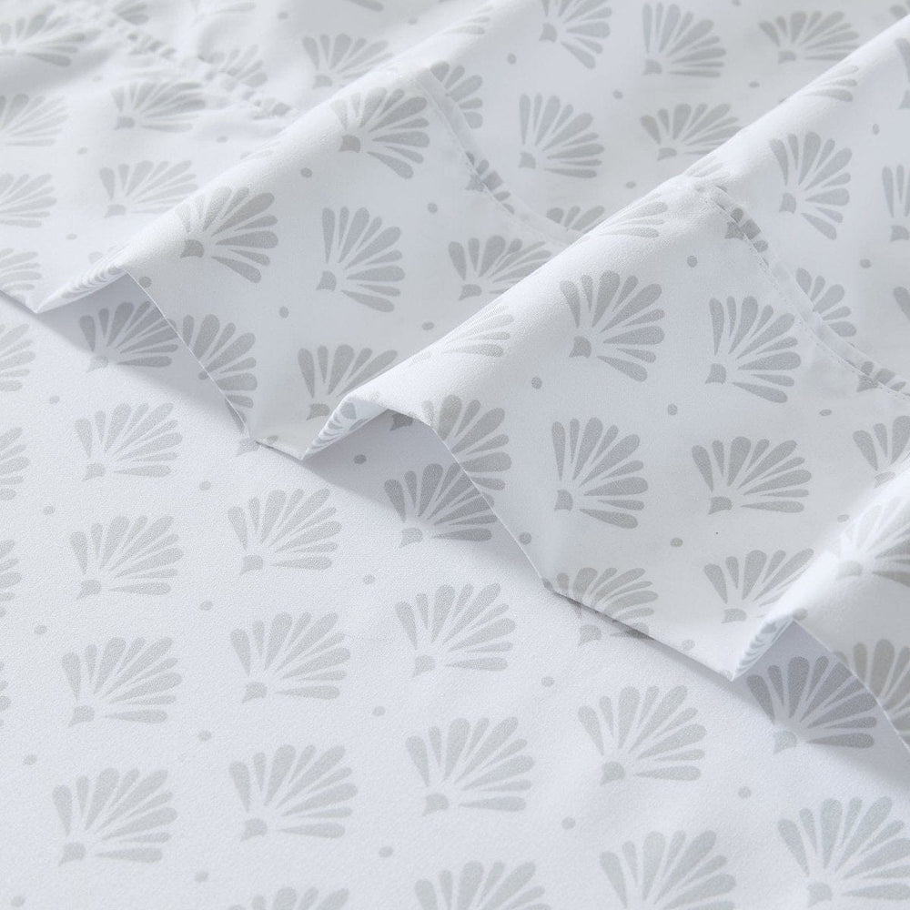 Add timeless art deco style to your bedroom with this beautiful sheet set. Easy to style, these neutral bed sheets display a pattern of fan-shaped motifs, inspired by the vintage-glam aeshtetic. These soft sheets are the soft centerpiece you need for an art deco, glam, or modern style bedroom. Crafted from a soft microfiber, this multi-piece set includes 1 flat sheet, 1 fitted sheet with a 14" drop pocket, and 2 or 4 pillowcases. STANDARD 100 by OEKO-TEX® certified, all components have been tested and certified free from harmful substances. Machine washable.