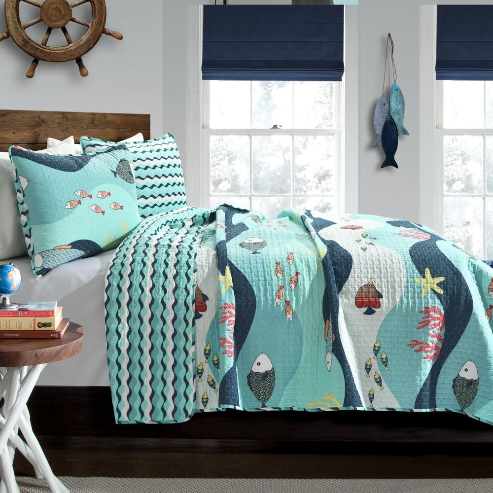 Decorate your child's bedroom with the fun Lush Decor Sea Life Reversible Quilt Set. Dive to the ocean floor with this coastal bedding, featuring a pattern of swimming fish, coral reefs, and colorful waves. Enjoy 2 looks in 1 set! Easily switch up your kids bedroom decor by flipping this reversible quilt over to reveal a coordinating blue wave pattern. This 2 piece twin size bedding set includes 1 quilt and 1 pillow sham. Crafted from 100% cotton fabric, this twin quilt set offers softness and comfort. The lightweight cotton blend filling is perfect for any season, and even makes this a great layering piece. To care for this twin size quilt set, simply machine wash cold on the gentle cycle and tumble dry low for a quick refresh. If needed, use an iron on low heat to release wrinkles.