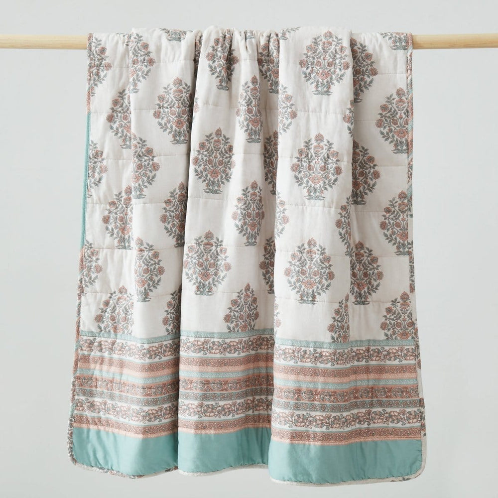 Decorate your space with this charming floral blanket. Designed with a traditional flower block print, this reversible throw effortlessly blends boho and vintage styles. This throw blanket is a perfect layering piece for your bed, couch, or chair. It's the perfect size for two adults to snuggle in together. Crafted from 100% prewashed cotton with a cotton filling for a soft and cozy feel. This throw blanket measures 50 inches wide by 60 inches long. Machine washable.