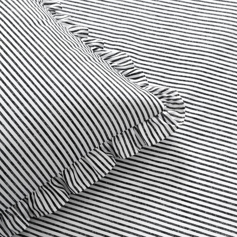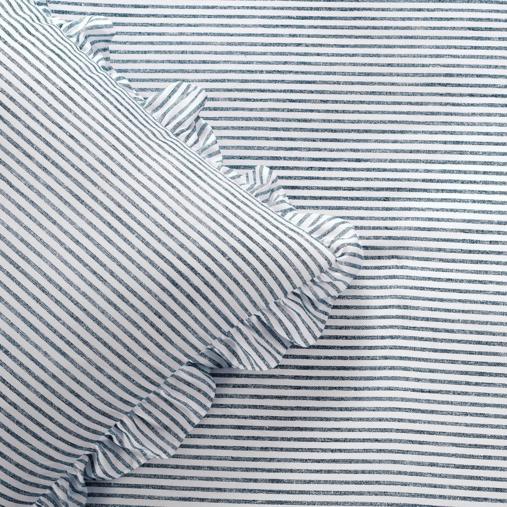 This Ticking Stripe Bedspread Set is very trendy. The classic pinstripes printed on the front never go out of style, and the ruffled edges are very chic and stylish.