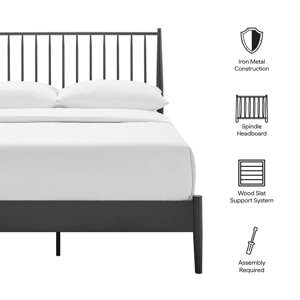 Blending classic charm with modern edge, the Adair Full Platform Bed makes a bold yet versatile statement in any bedroom. Crafted from durable iron, this full size bed frame features a tall spindle headboard that nods to classic farmhouse and mid-century modern aesthetics alike. The clean lines and vertical rods create a striking focal point, while the low-profile platform bed frame adds a grounding presence that complements both minimalist and traditional interiors. A series of sturdy wood slats provides reliable support for your mattress; no box spring required; while center support legs add enhanced stability. From urban lofts to cozy cottages, this metal spindle bed delivers enduring style, strong construction, and everyday comfort. Weight Capacity: 400 lbs.