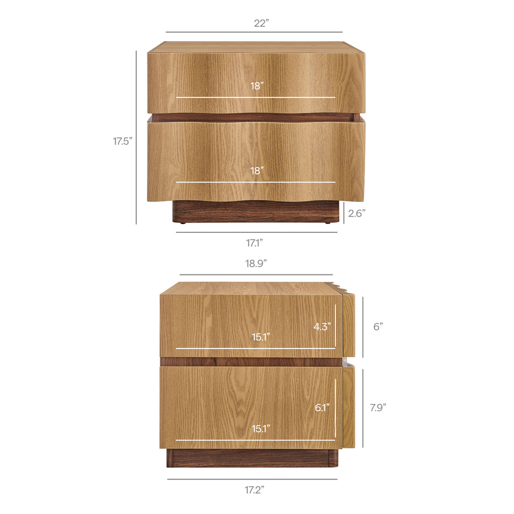 The Isola 2-Drawer Nightstand brings modern character to the bedroom with its smooth lines and distinctive design. This 22 Inch wood nightstand provides two roomy drawers that offer practical storage for everything from books to nighttime essentials. Resting on a plinth bottom with discreet plastic floor glides, the Isola bedside end table also works well as a living room end table or as an accent table in small spaces. Its clean profile and natural wood tones make it a timeless addition to any interior. Assembly required.