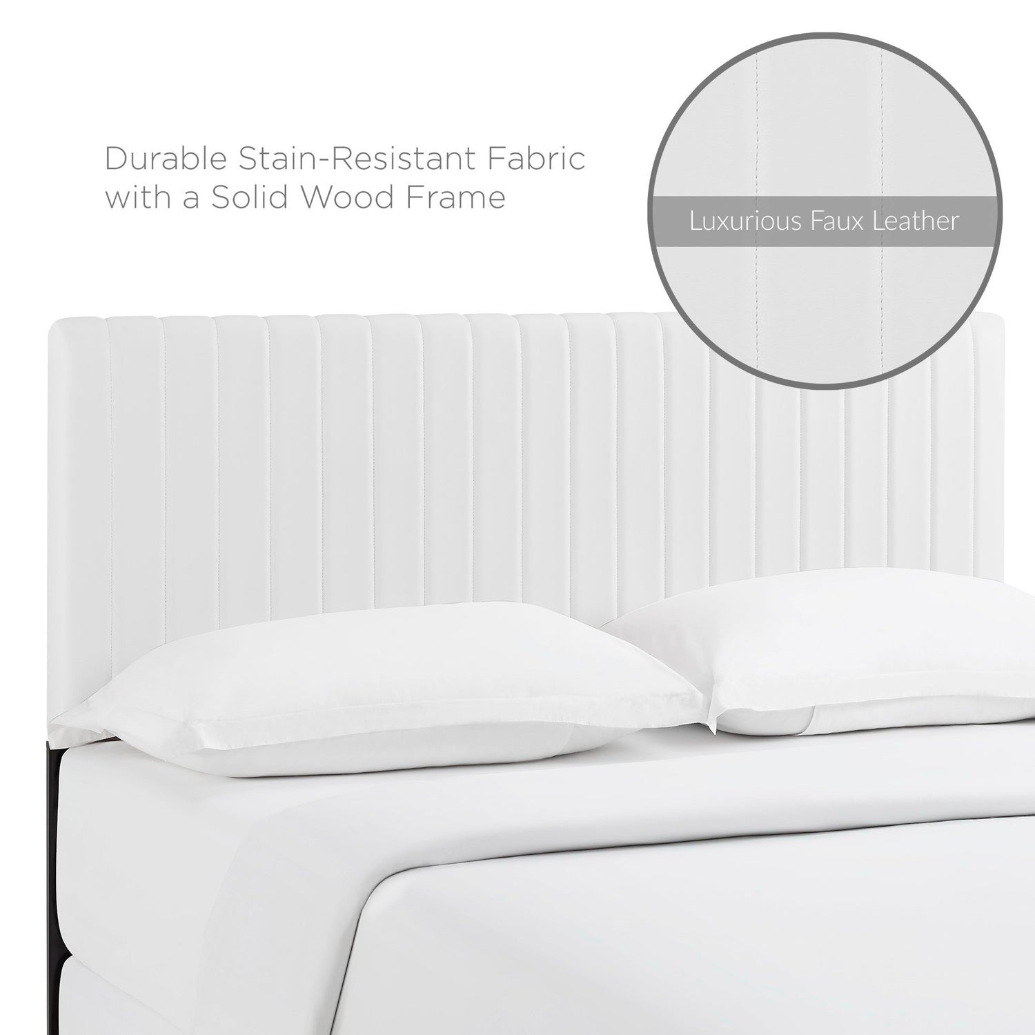 Refresh your master bedroom or guest suite with the Keira Full/Queen Headboard. This elegant queen headboard makes a luxe statement with its channel tufting, smooth texture, and chic squared profile. Boasting a modern design with timeless appeal, this upholstered headboard is covered in luxurious faux leather and features a solid wood and particleboard construction that�s durable and long-lasting. Lean back and relax while reading or watching TV in bed with the dense foam padding on this upholstered queen headboard. Fits queen and full size beds.