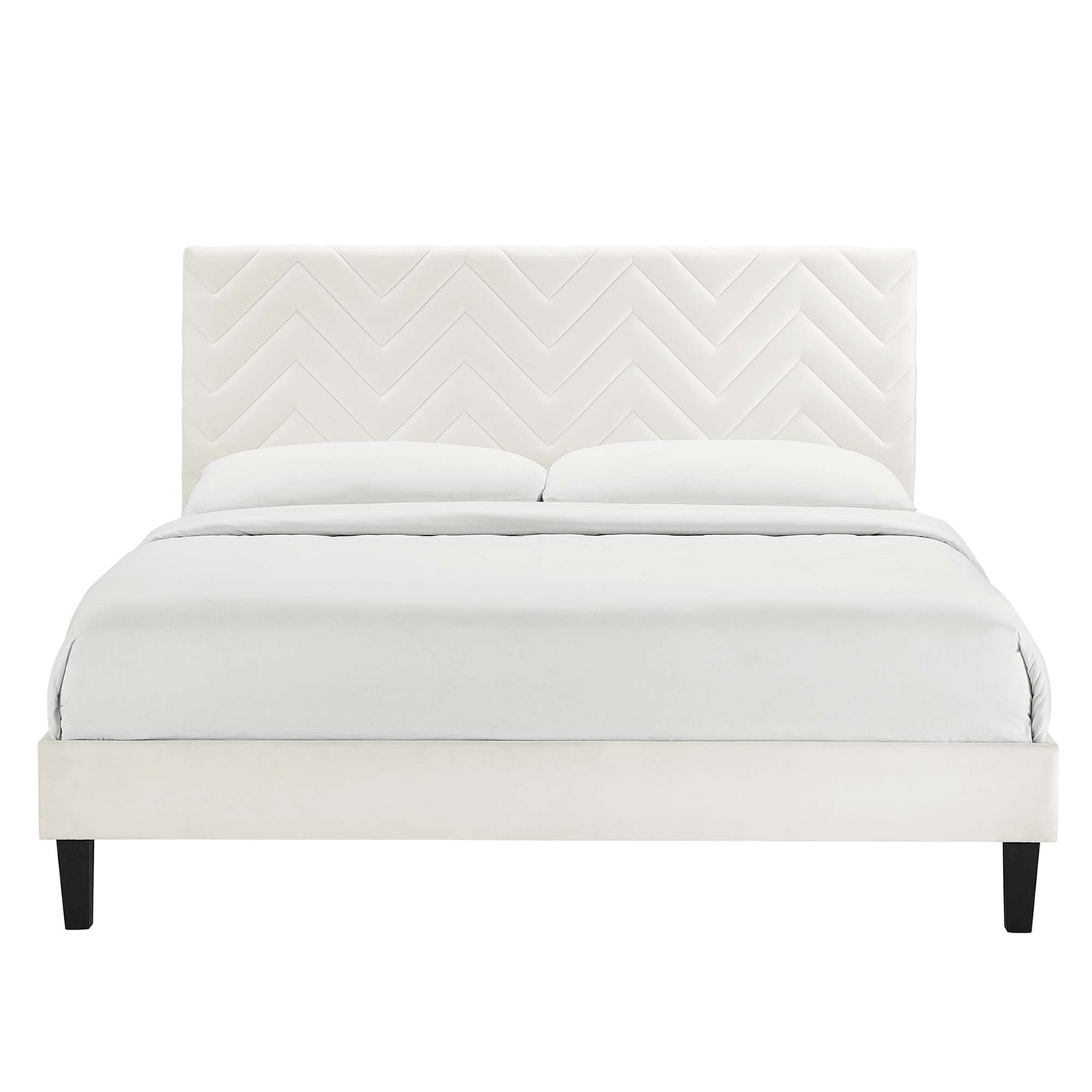 Introduce contemporary elegance into your child's bedroom or guest room with the Leah Chevron Tufted Performance Velvet Twin Platform Bed. The upholstered headboard boasts a glam deco zigzag design and dense foam padding for luxe comfort. Tailored in stain-resistant performance velvet, this twin-sized bed complements mid-century modern or eclectic decors. With a sturdy MDF frame, the Leah Twin Platform Bed is a lasting foundation for memory foam, innerspring, latex, and hybrid mattresses. The well-crafted poplar wood slat support system eliminates the need for a box spring, ensuring durability and firm support. This twin platform bed rests on tapered black wood legs with non-marking foot pads. Assembly required. Weight Capacity: 800 lbs.